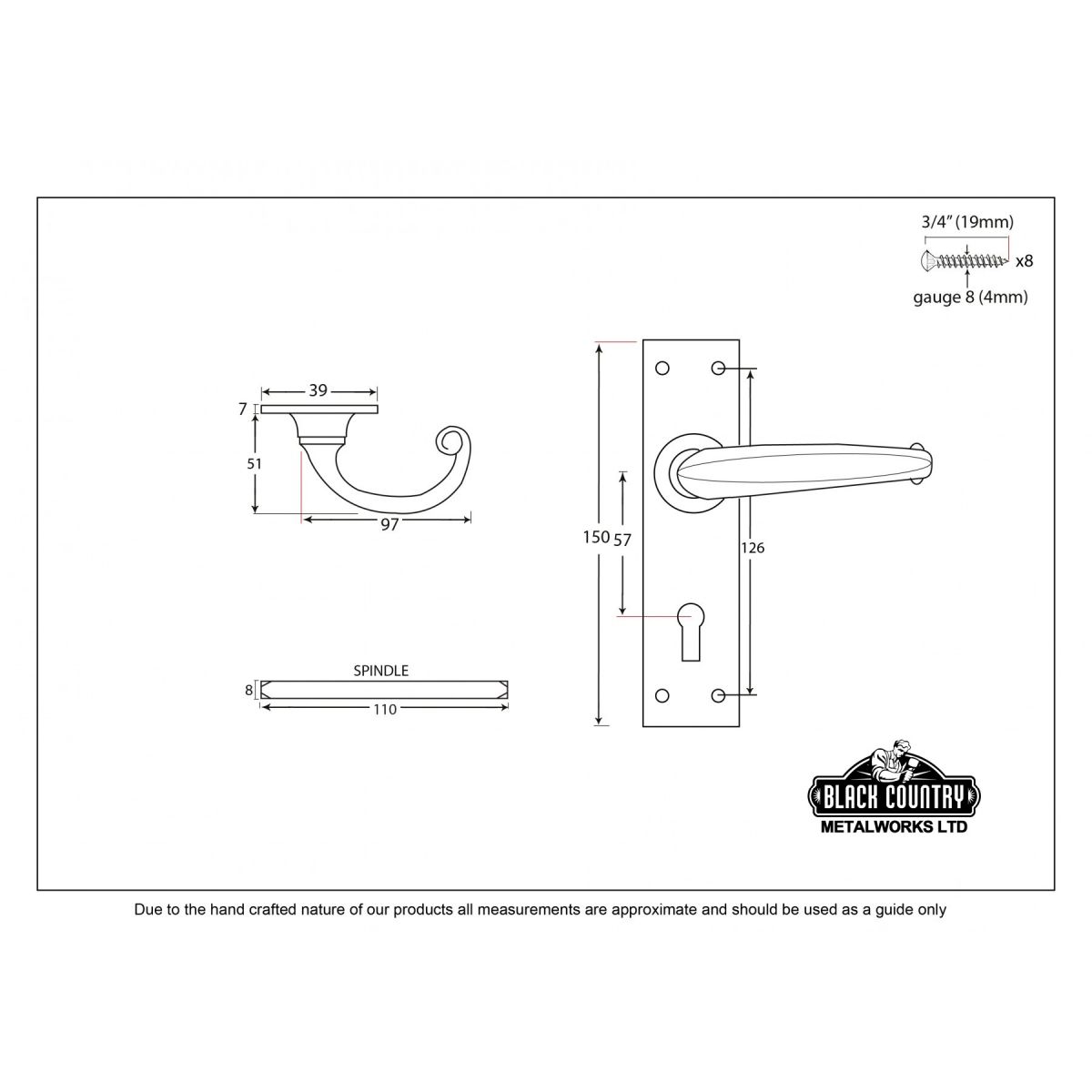 The distinctive returning scrolled handle on this iron lever lock handle set is set upon an imposing risen circular boss. Pre-drilled with matching fixtures, it is available in a matte black iron finish. See below for finish details