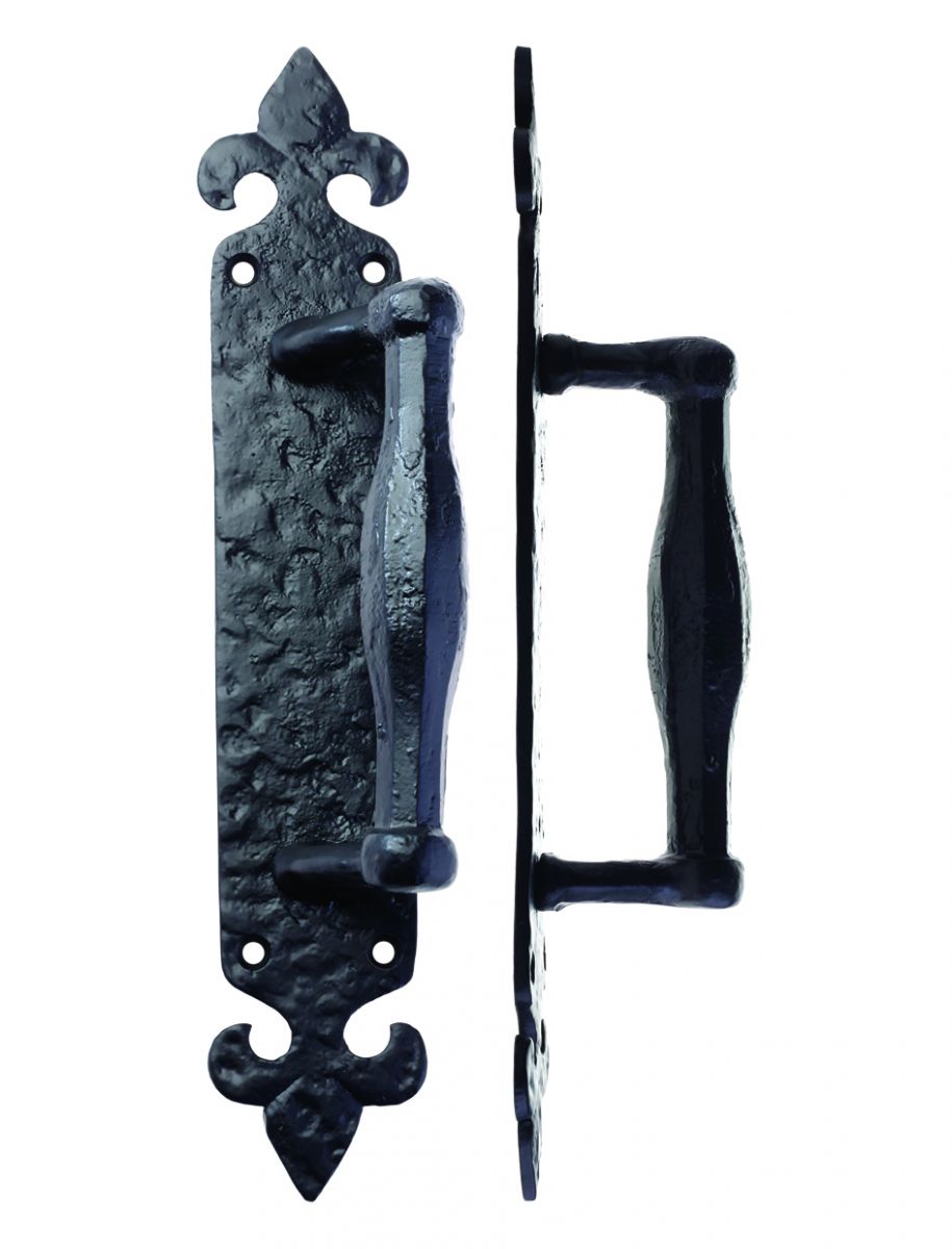 The medieval style of this piece is enhanced further by the traditional black iron finish. Fleur de lis finials are mounted on the backplate, giving the piece a stunning period look. The offcentre handle is reversible and can be fitted to a left or right handed door.