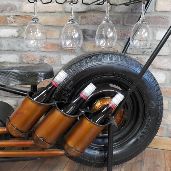 Crafted from recycled motorbike parts, this unique bar stand is the ideal accessory for any motorbike enthusiast, after a splash of originality in their home bar. Featuring a storage shelf attached to the freestanding bike, there is storage for wine glasses underneath, making this a versatile product as well as practical. Text on the bike reads “Meets Rock”, referring to the motorbike most popular in bike meets.