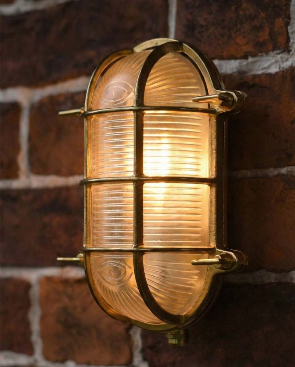 Illuminate your garden, drive or porch with this charming wall light skilfully crafted with a solid brass body and glass diffuser. The oval shaped light with cage design is based on classic bulkhead lights which today are incredibly stylish industrial design staples. The cage design is not only stunning but provides additional protection to the light and glass diffuser.