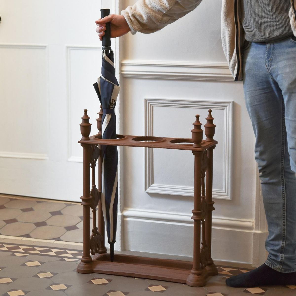 Crafted from high quality robust cast iron and finished in an antique brown finish, this gorgeous rectangle umbrella stand, features three circular openings, so walking sticks and umbrellas can be left upright when not in use.  Designed with four corner urn shaped finials and a glorious elaborate design throughout, this umbrella holder oozes traditional and Victorian style.  Designed to be freestanding, this umbrella holder will look ideal in homes, airbnbs and hotels.