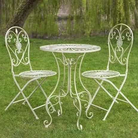 Add some country charm to your garden or patio area with this gorgeous two seater and table bistro set. Crafted from high quality grade steel and finished in an antique cream finish, this bistro set features delicate leaf, heart scrollwork and lined framework. Its brushed finished adds to the rustic aesthetic and country charm. A must have when relaxing in the summer sun.