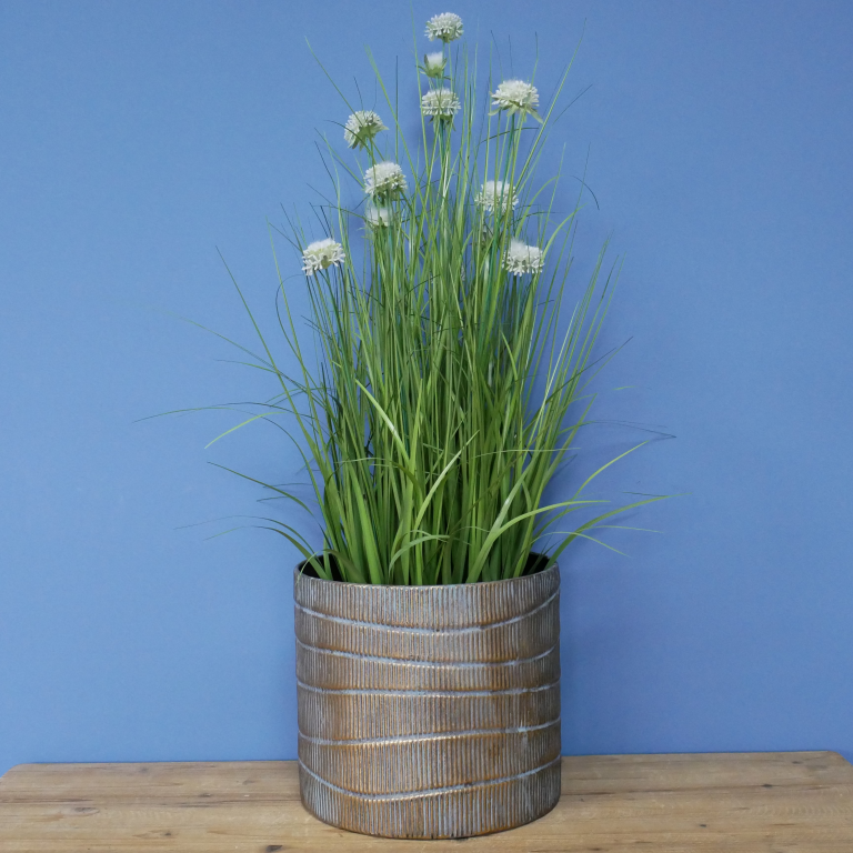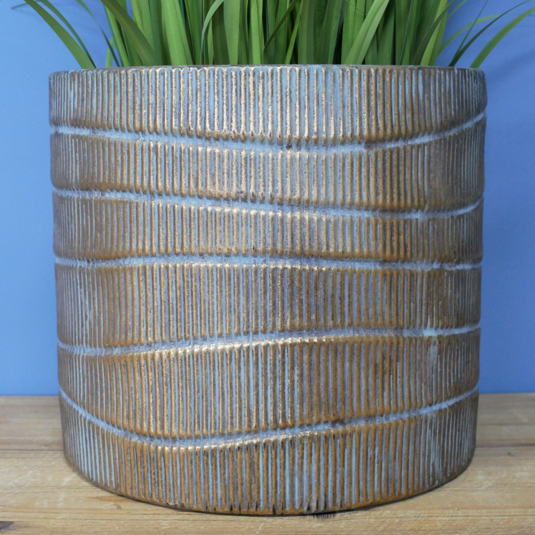 Add some style and practicality to your home with this fantastic, ribbed design planter. Unique in style and pattern, this antique gold planter is ideal for sprucing up living spaces with plants. Offering a unique texture, this planter features a Verdigris finish which adds extra colour and character to the piece. Plant not included. Indoor use only.