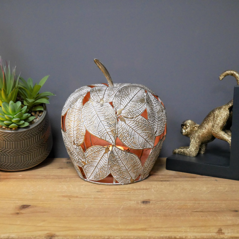 Completely unique in design, this wonderful candle holder features the design of an apple, crafted from metal and put together using metal leaves which would normally be featured on an apple stork. Finished in a brushed white and gold finish, this candle holder will add atmosphere and charm to any interior décor setting. Where each of the apple leaves join, small areas allow the light to escape whilst a hanging candle holder sits within the centre of the apple structure.