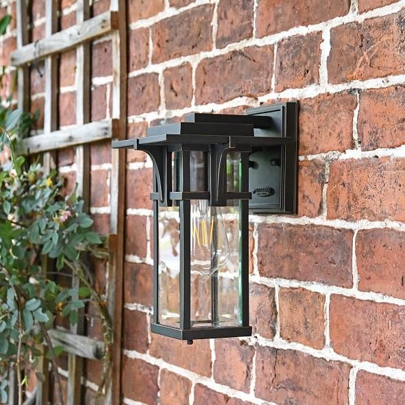 Taking inspiration from moderrn art deco design in its clean lines, angular shapes and deep bronze finish, this lantern is the perfect way to add a touch of contemporary style to the exterior of your property. This lantern comes fitted with a top-mounted bracket and rectangular back plate in a matching finish, making it ideal for fitting above a door or entryway. Complete with four panes of clear glass and a built-in upper bulb holder for maximum downward light projection.