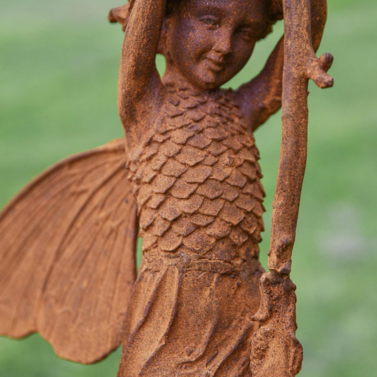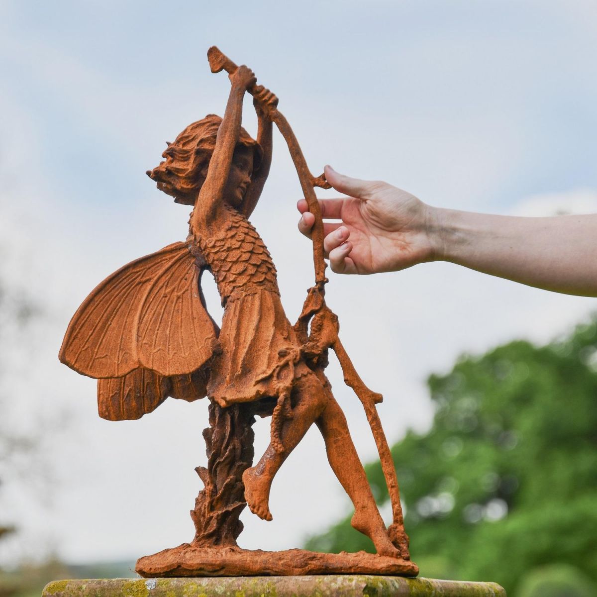 Created and cast from iron and left to age to form a natural rustic finish, this gorgeous and whimsical garden sculpture depicts a winged fairy as she swings from a branch. Despite being created from a cast moulding, this sculpture is exquisitely detailed throughout from the strands of hair to the scaled bodice and veins within the wings, this garden sculpture is a must for bringing character and charm. Stood on an integrated base, it makes for easy installation onto plinths, patios and flowerbeds.