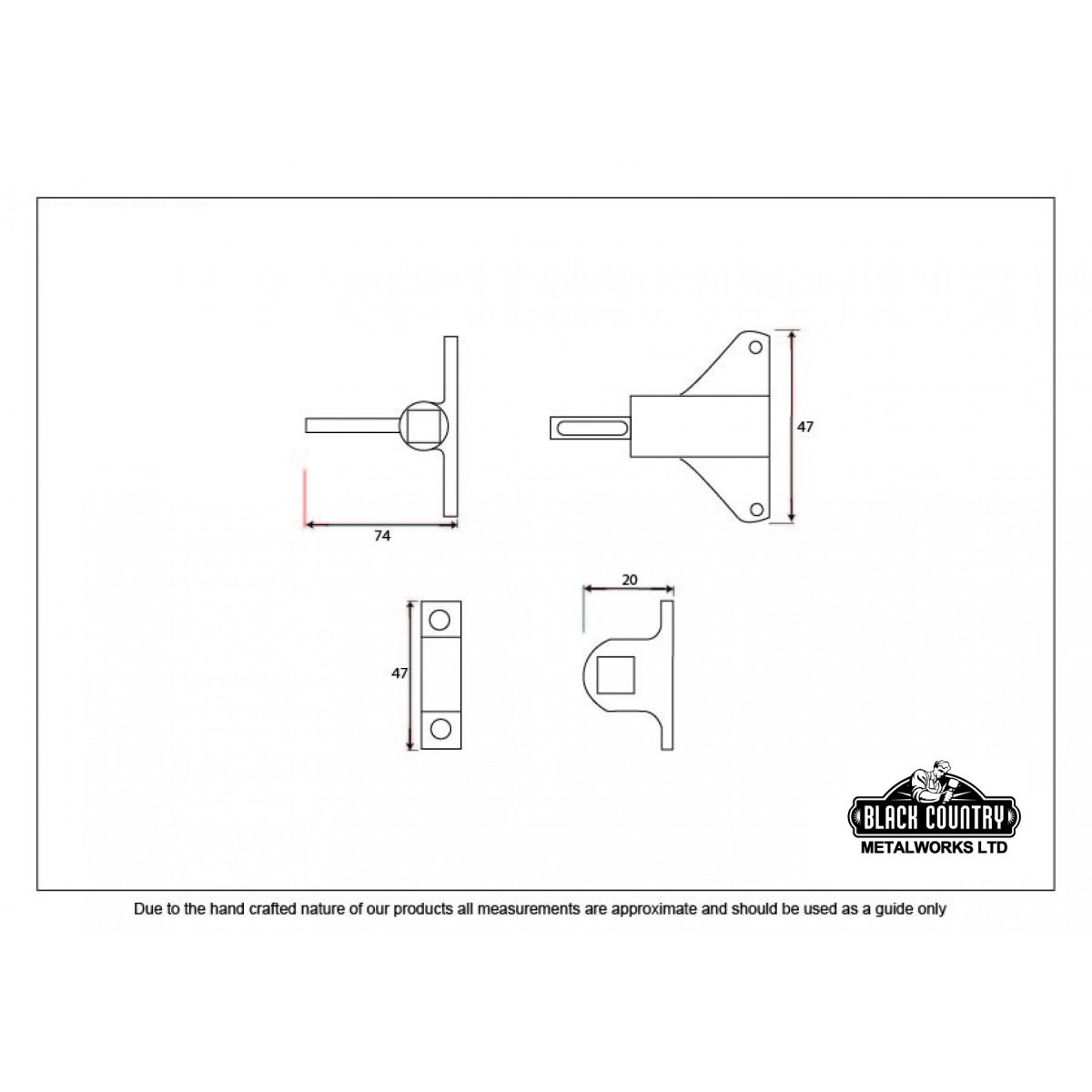Simple monkey tail fanlight catch in classic black iron. Complete with two keeps for either flush or recessed fitting. All necessary fixing screws included in a matching finish.