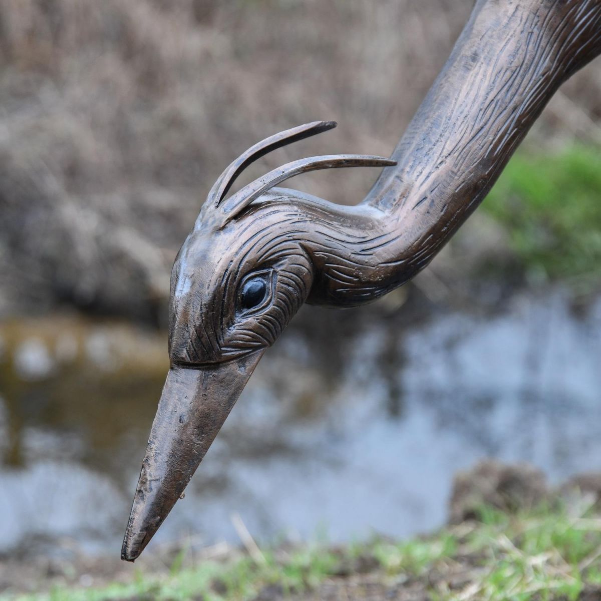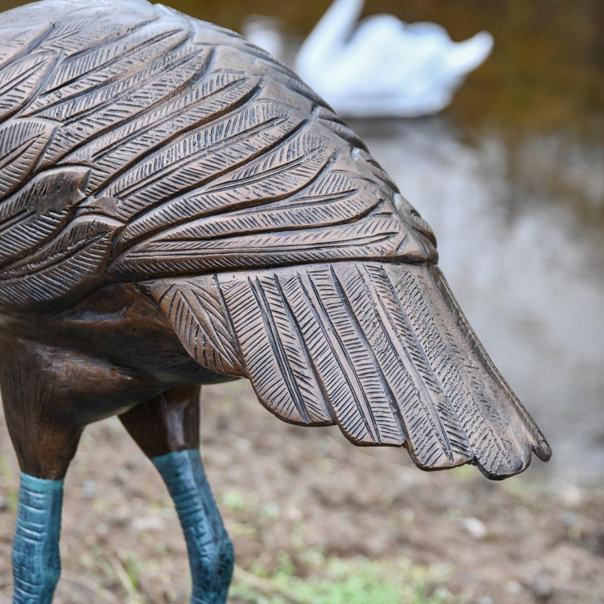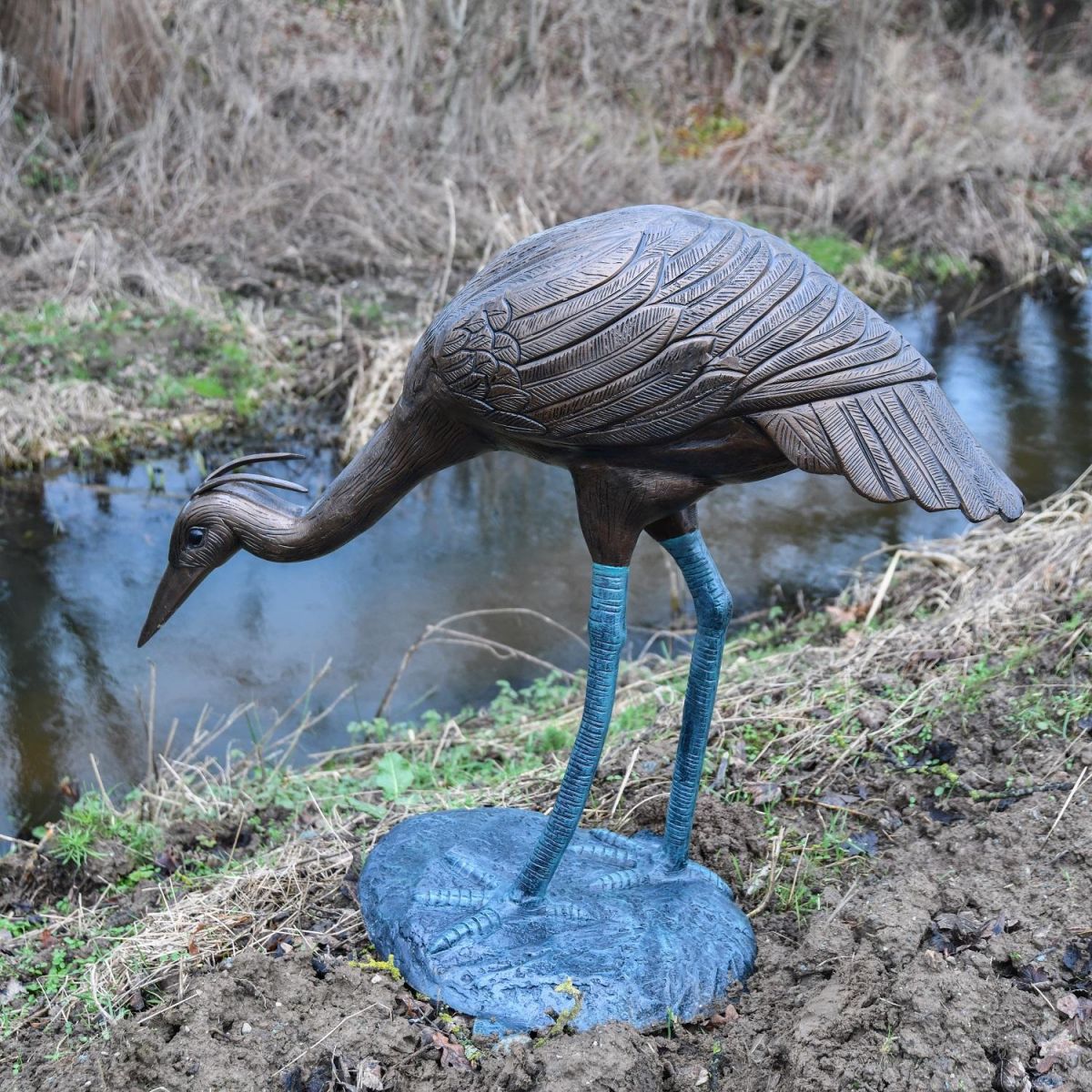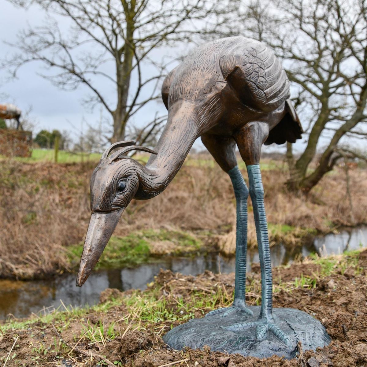 Crafted from high quality aluminium, this fantastic crane sculpture has been finished in a copper toned finish, with Verdigris detailing to extenuate and highlight the life-like details throughout. With an integrated base for stability, this crane sculpture will look ideal near pond or water areas as it will create a real life aesthetic to the surrounding area. With gorgeous wing feathering detailing and plums of feathers from the crown of the head, this sculpture will look ideal as a single item or paired with others.