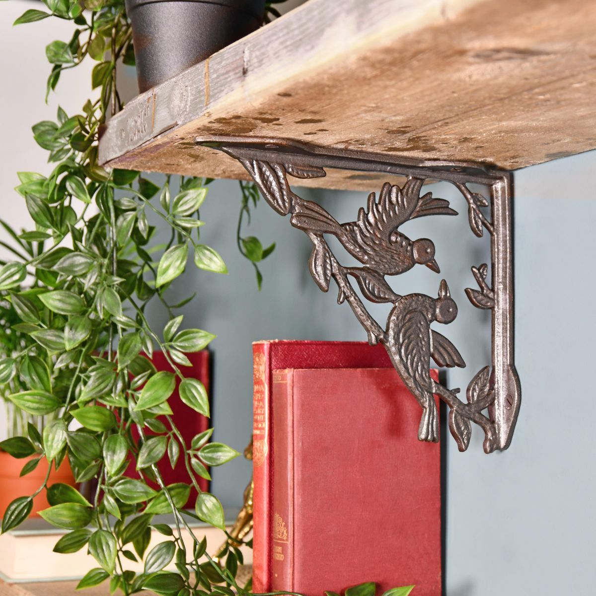 Made from cast iron, this ornate shelf bracket features two beautifully detailed birds perched among leaves and branches. Complete with six pre-drilled screw holes, this bracket is ready to be mounted to your desired wall.