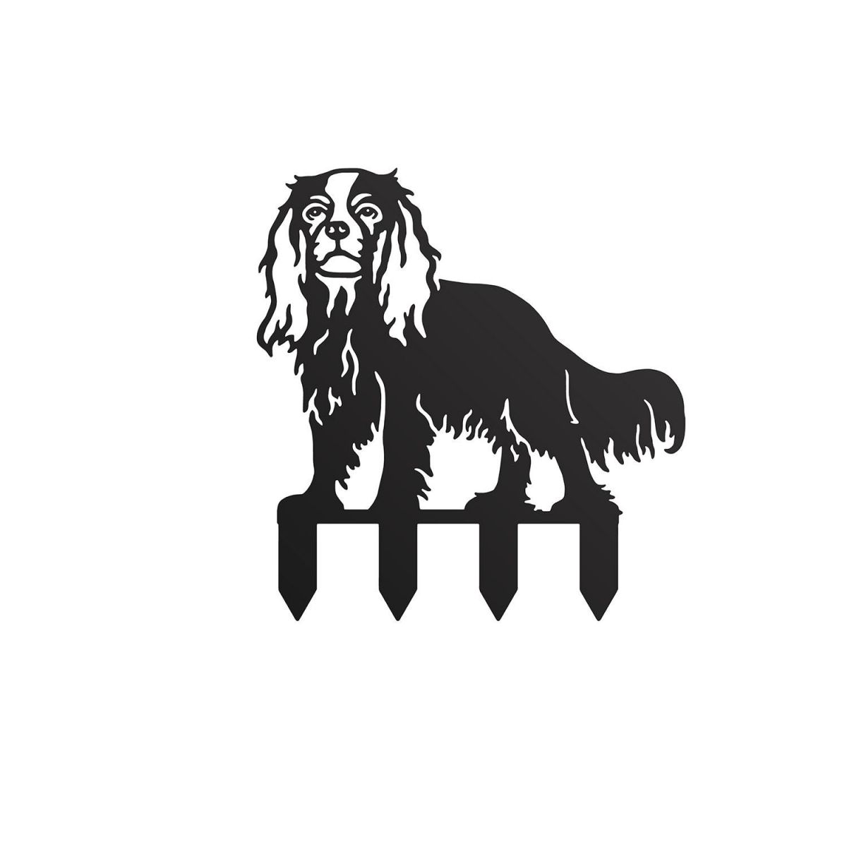 Crafted from high quality steel and finished in a midnight black finish, this garden silhouette features the outline of Cavalier King Charles Spaniel, a once royal breed of dog owned by Elizabeth I, Charles I & Charles II. Part of the Toy group, this breed of dog is now a favourite amongst families due to friendly temperament. Complete with four integrated ground spikes on each of the legs, this garden silhouette can be placed directly into the ground with ease. Place into the grass, within flowerbeds or along pathways.