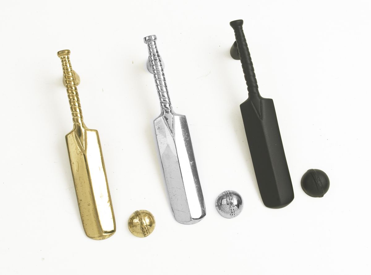Highly detailed cricket bat door knocker in a black iron finish. The tapered bat shaped beater is hinged at the top fixing plate and connects with the seamed cricket ball style striker stud for a gratifying knocking sound. The slim line design make this door knocker suitable for a variety of door sizes, even those with a very thin central panel.