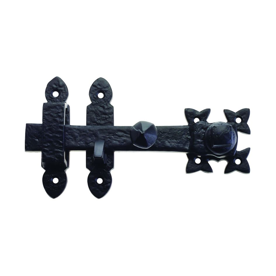 This black iron straight latch is securely fixed with four strong, fleur-de-lis style, points with pre-drilled holes. Also featuring a latch rest with acorn shaped fixing plates, the antique look of this piece can be maintained by regular wiping with a lightly oiled cloth. All necessary screws included.