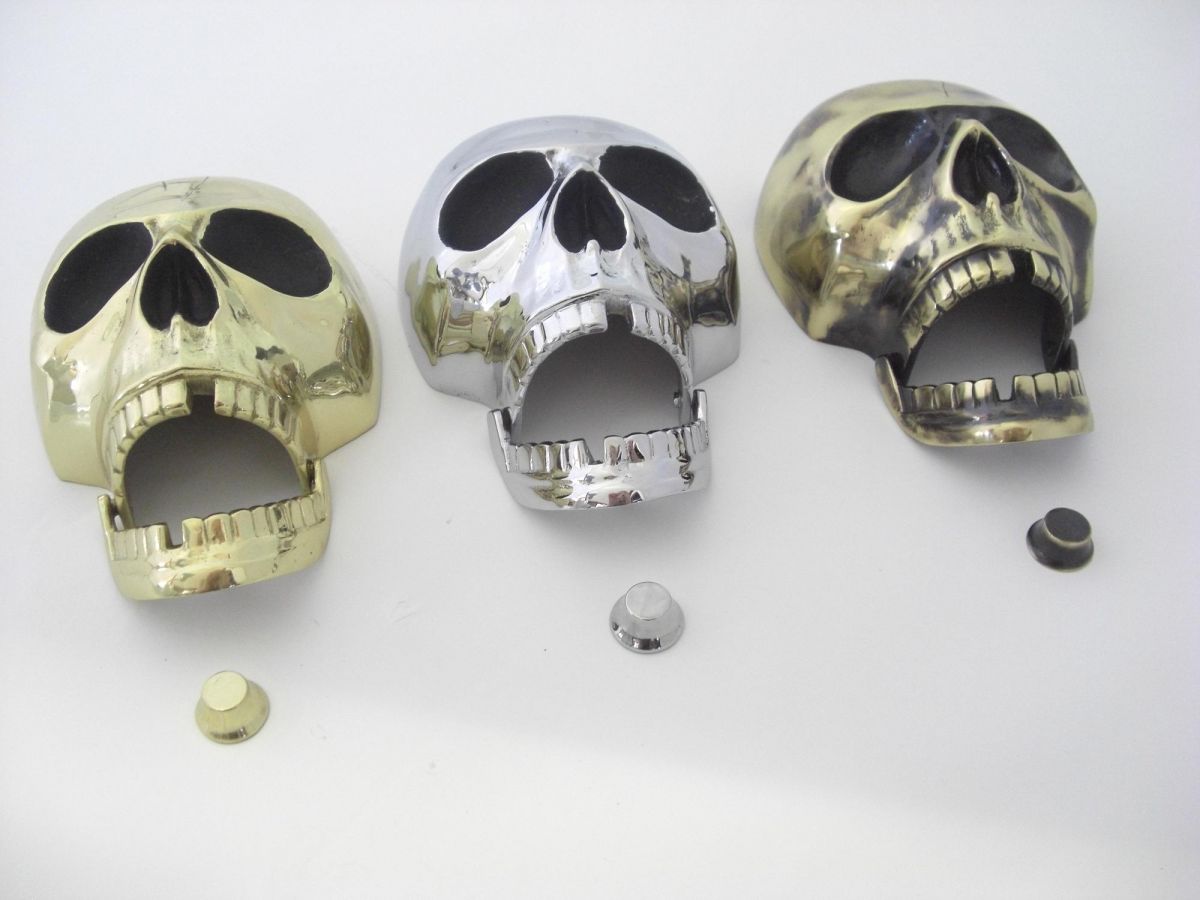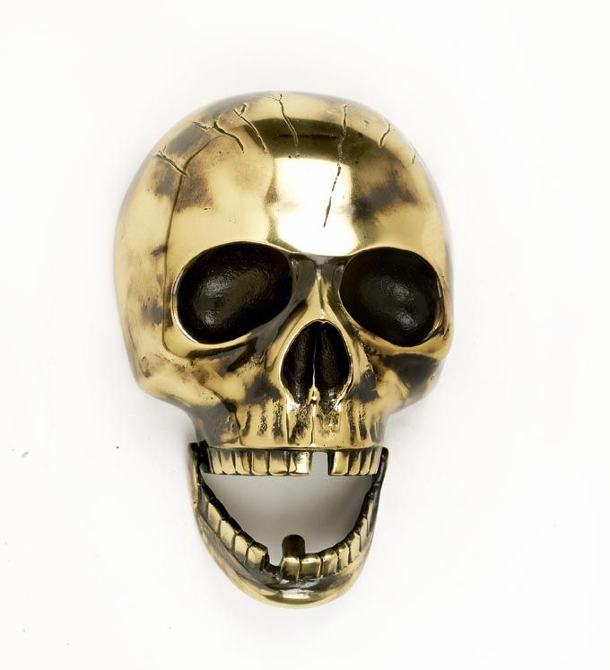 The larger version of our polished brass skull door knocker this piece is even more imposing and impressive. Crafted from solid brass the lower jaw is on a hinge and connects with the supplied striker stud. The cracked detail on the top of the skull and forehead and deep eye sockets give a truly authentic, Gothic style.