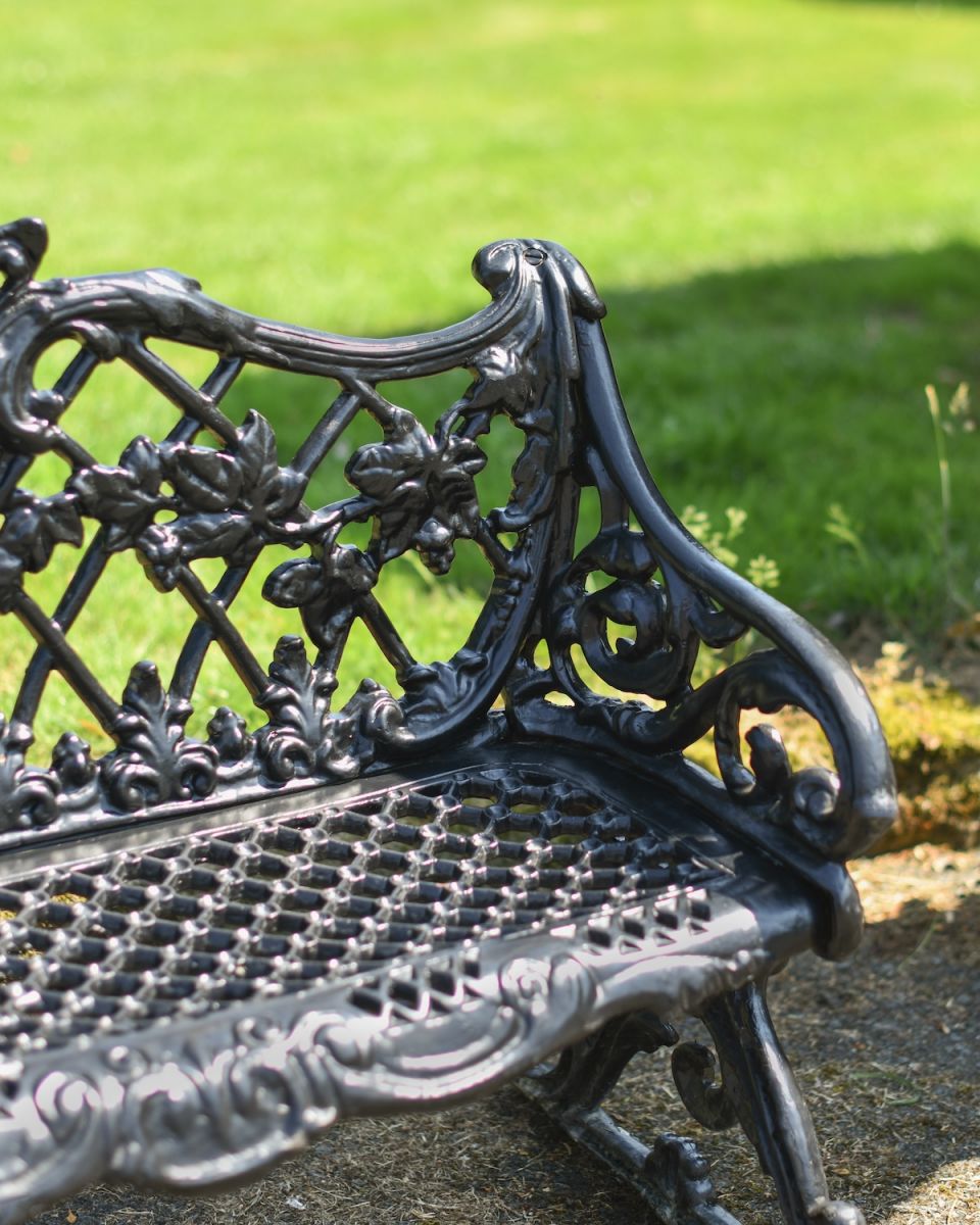 Crafted from high quality cast iron and complete with a classic black finish, this gorgeous two seater garden bench is the perfect accessory for those who want to add style and relaxation to their space. The ornate backrest features leaf detailings, along with lattice design for comfort. The supportive seat is joined by equally ornate arm rests, and the four legs can be placed on grass, patios or concrete.
