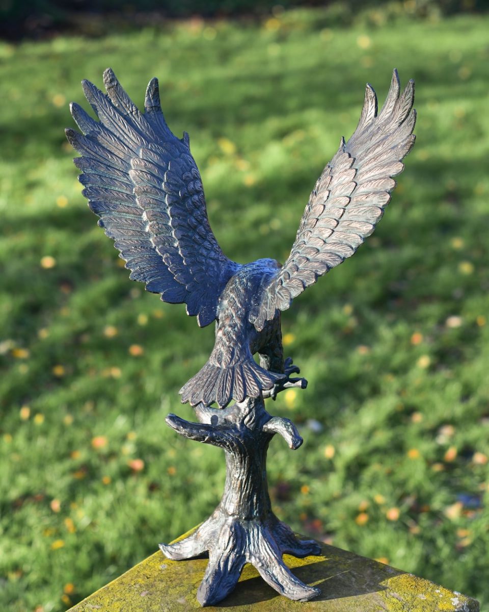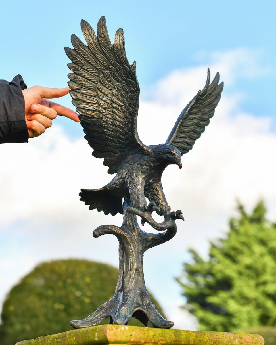 Invite this proud golden eagle to stand guard over your garden or grounds from his perch. His piercing expression and magnificent, textured feathers have been etched into cast aluminium, creating a truly fascinating piece of high-quality metalwork. Pay tribute to the best-known bird of prey in the Northern Hemisphere by placing it on a garden wall or a plinth or as the centrepiece of your patio.