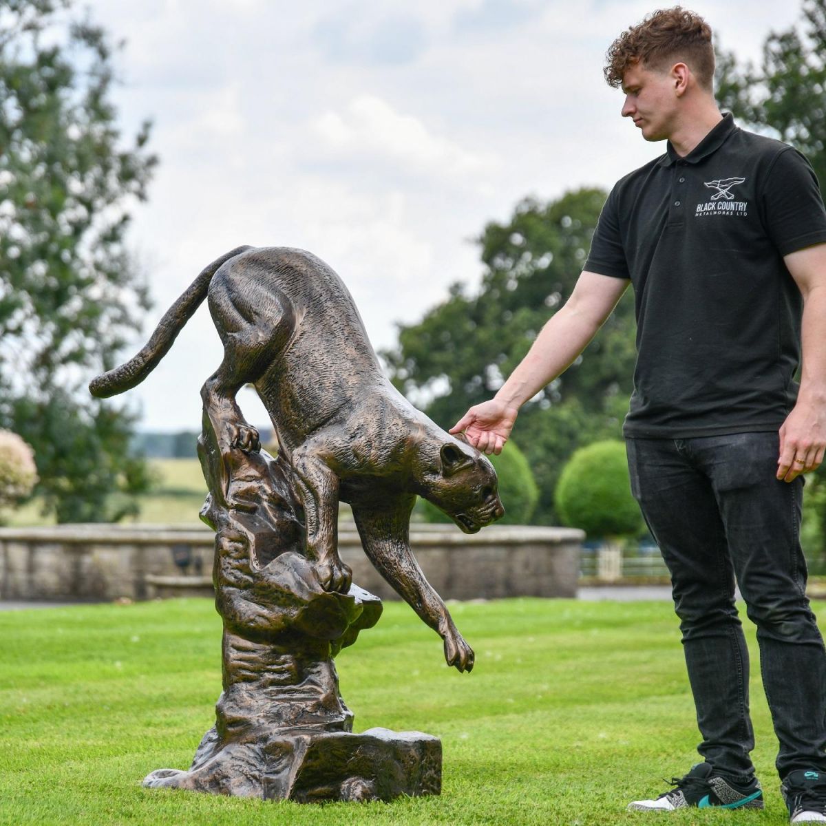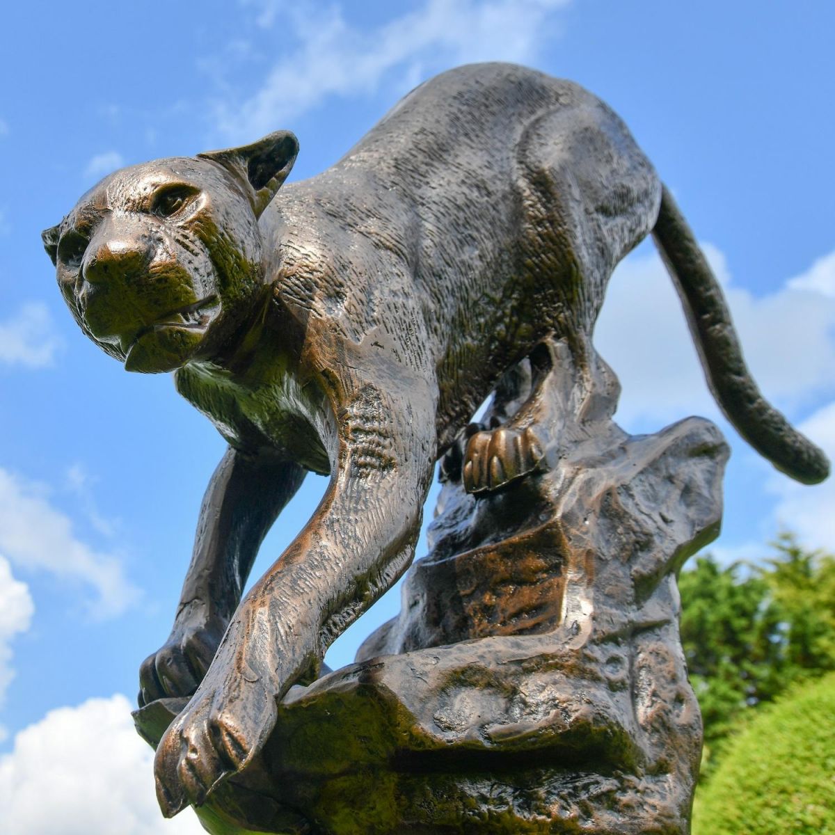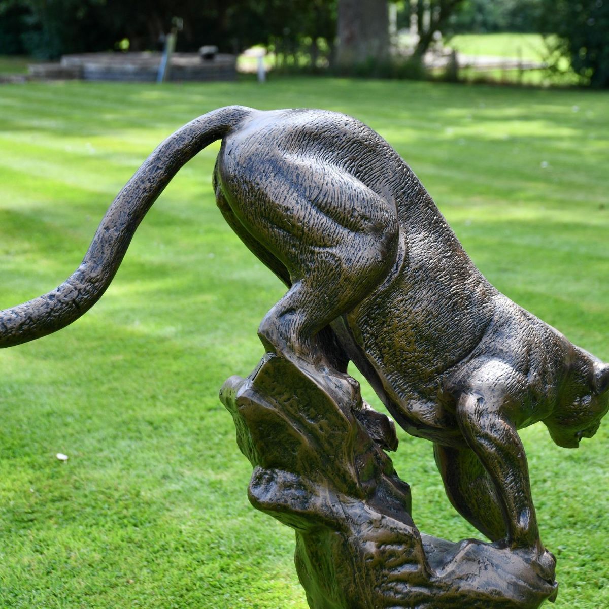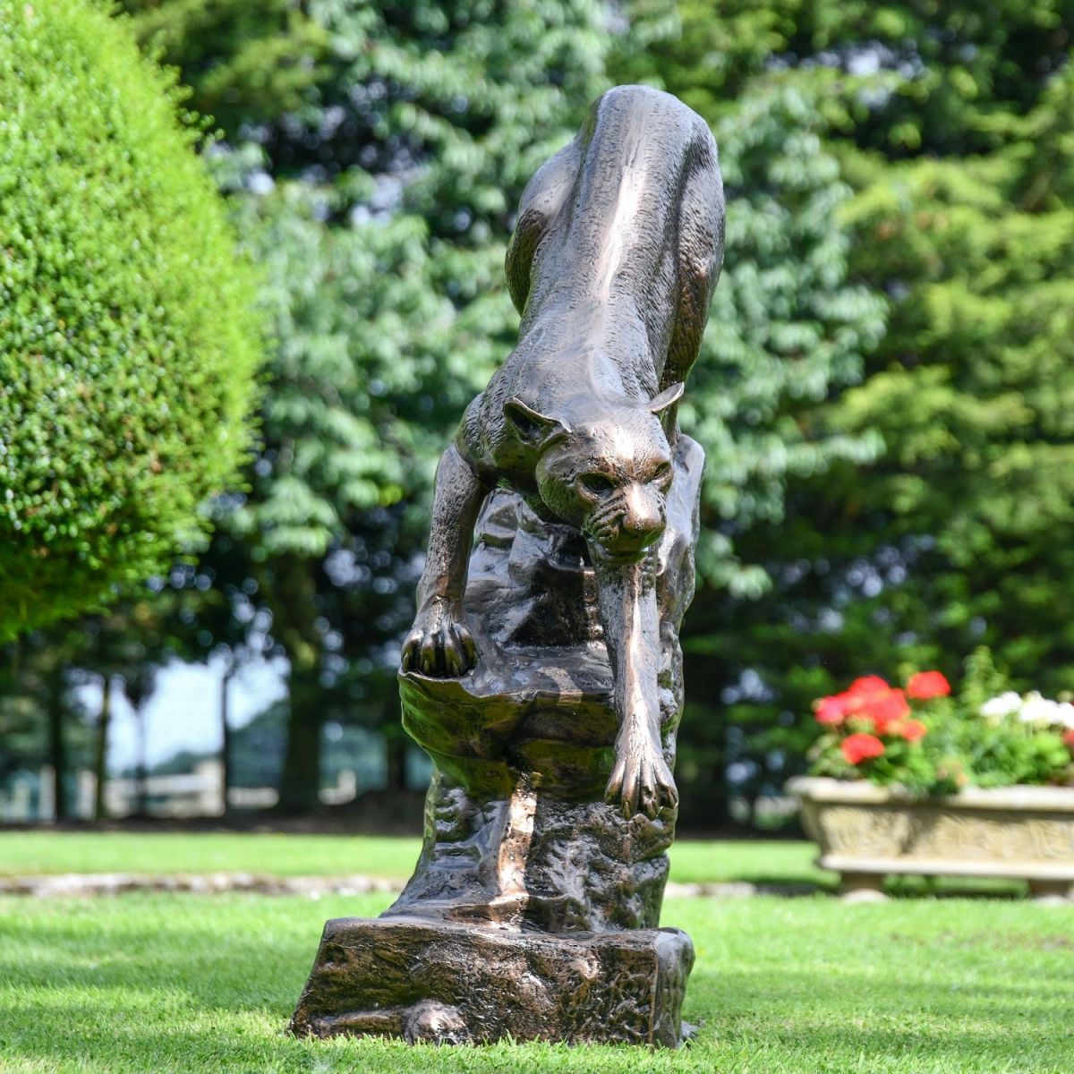 As if ready to pounce, this cougar sculpture is certainly an interesting addition to your garden or grounds. Expertly cast from robust aluminium and finished in a warm bronze, she's bound to add a sense of natural elegance to any outdoor space. Complete with her own integral rock-shaped stand, this majestic cougar is ready to be proudly displayed in any outdoor location.