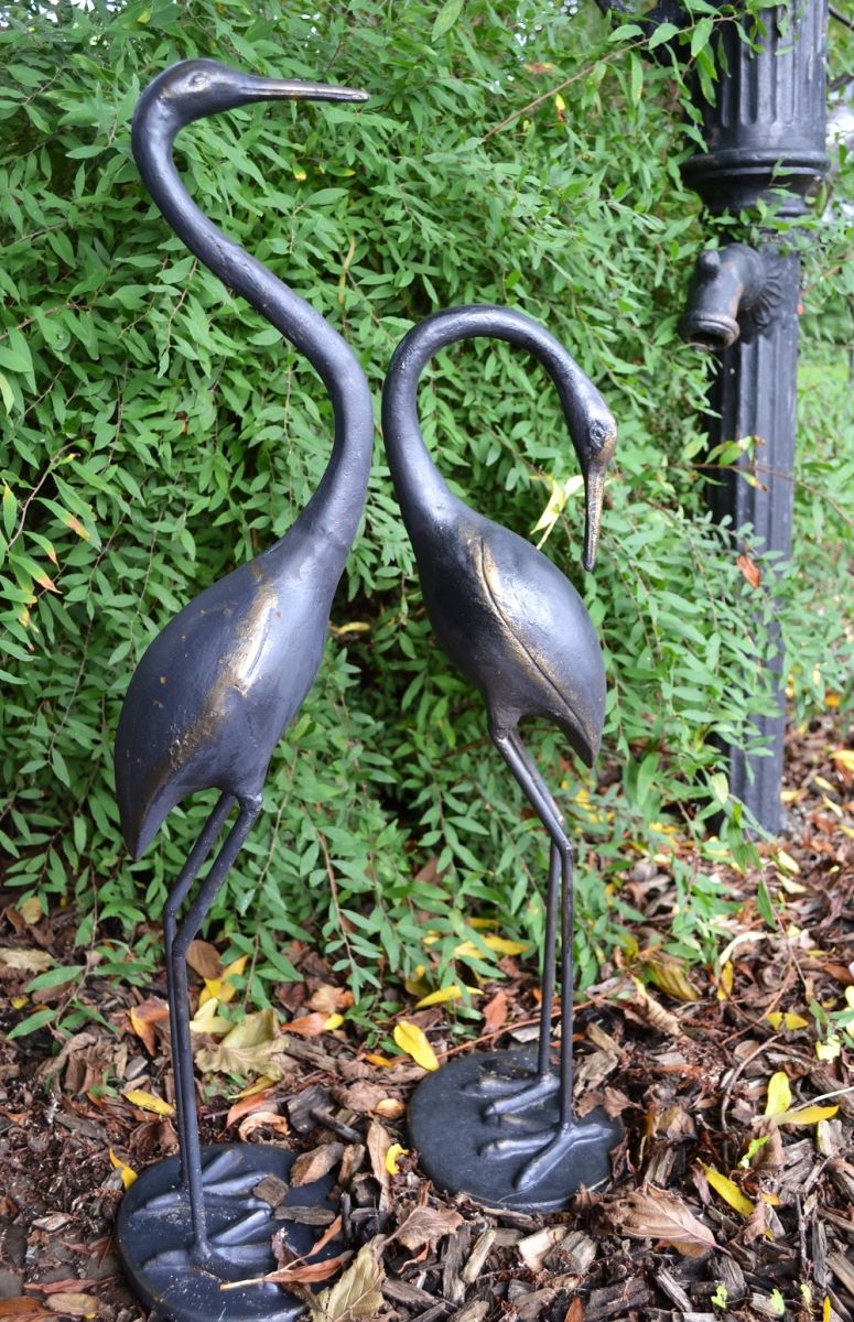 The epitome of elegance, these cast iron crane sculptures stands tall and solitary. These outdoor decorations have been mounted onto their own integral base allowing you to place them anywhere within your grounds. Finished in a rustic midnight black, these cranes have been adorned with regal gold detailing. With two stunning designs available, you are certain to find a style to suit the beauty of your outdoor space.