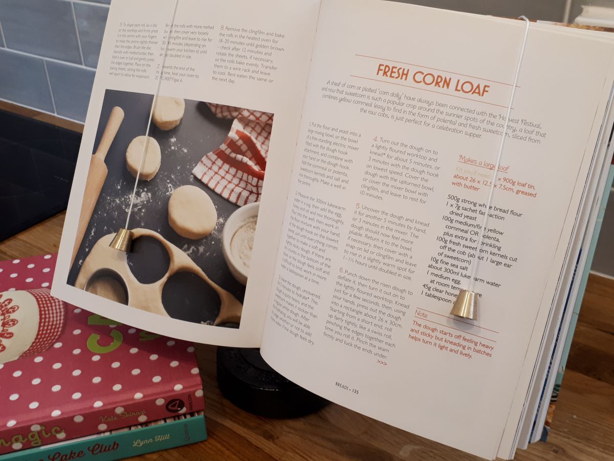 Classic cookbook stand that allows easy reference when preparing recipes. Available in a range of colours to suit all styles of kitchen. Comes with weights to keep book pages open at the right page.
