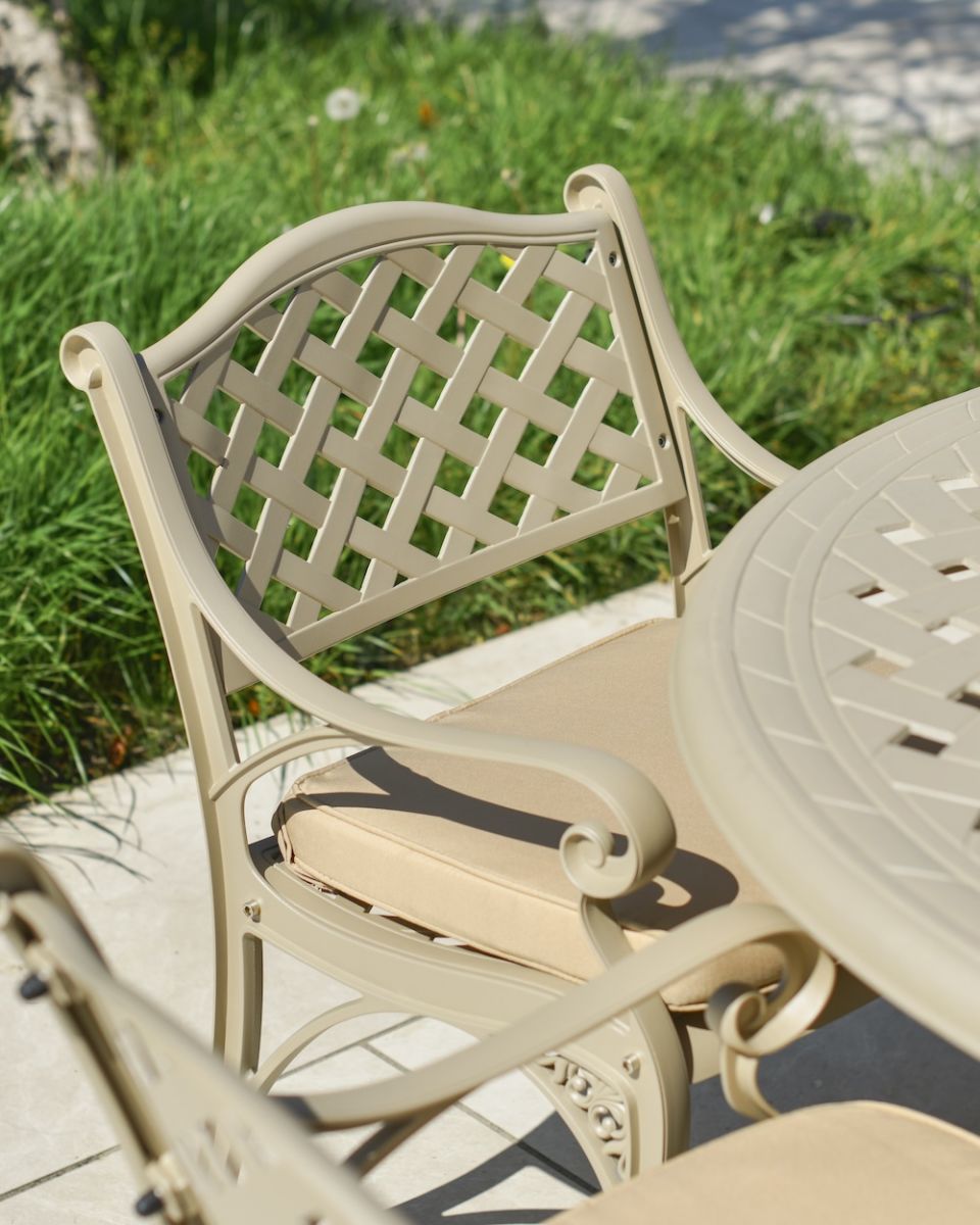 Get everyone seated with this fantastic aluminium garden furniture set. Crafted from heavy duty aluminium and finished in an beautiful champagne finish, this furniture set comes complete with six chairs and a circular table. Each of the six chairs have a diamond shaped backrest and a woven style seat for comfort and support during use. The circular table has four legs with adjoining supporting arms for stability. The circular table matches the same woven design on the chair seat, which brings the entire furniture set together.