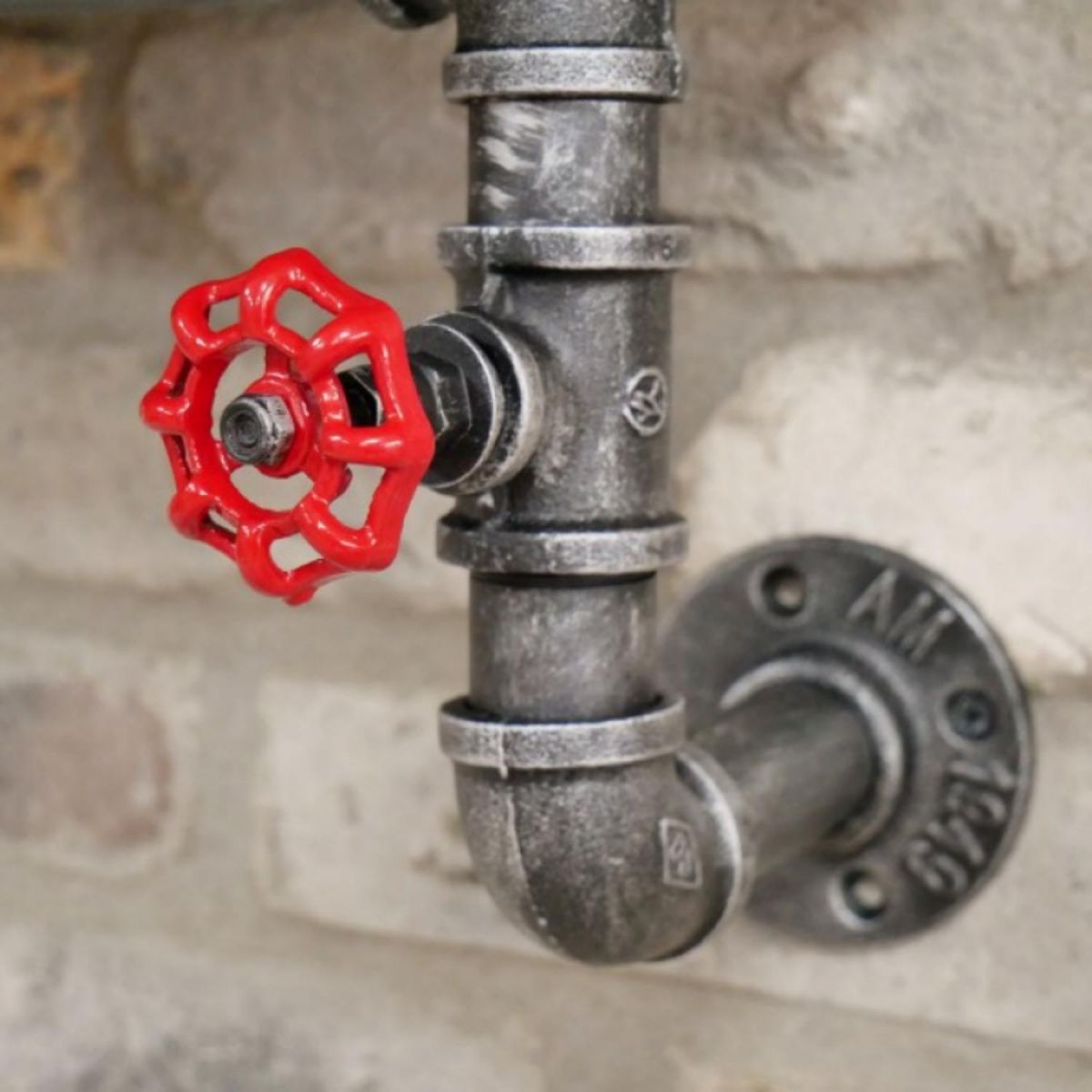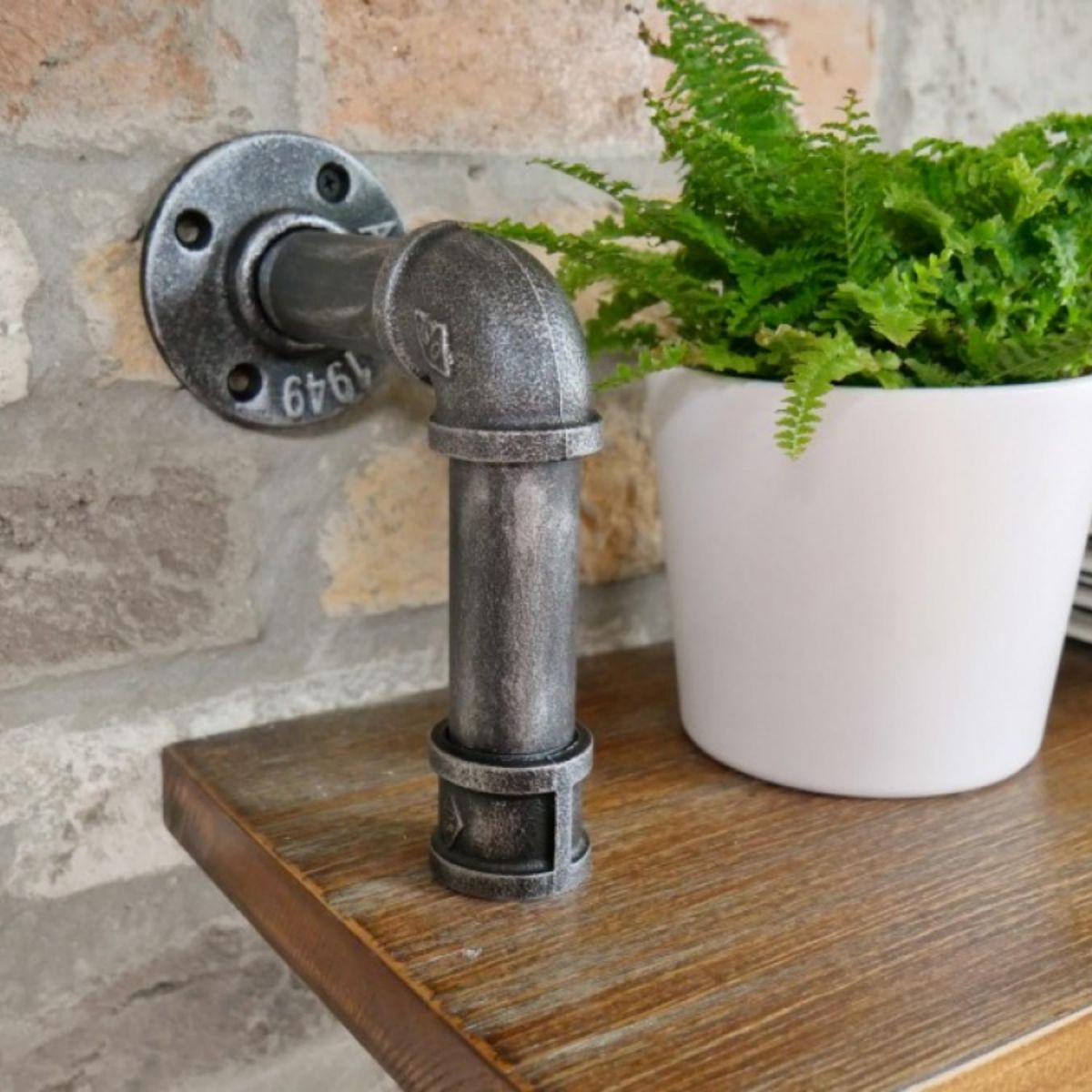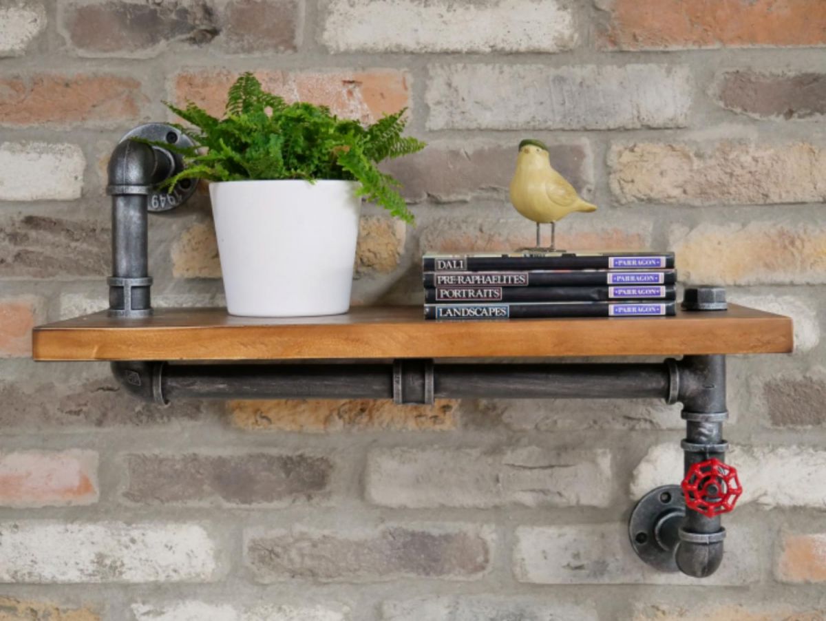 Unusual in design, the industrial elements of the pipe shelf are combined with the natural elements of a chunky wooden shelving unit to create this fun yet practical shelving unit. The frame of the shelf is made from iron pipes and has a decorative red valve on the bottom right pipe.