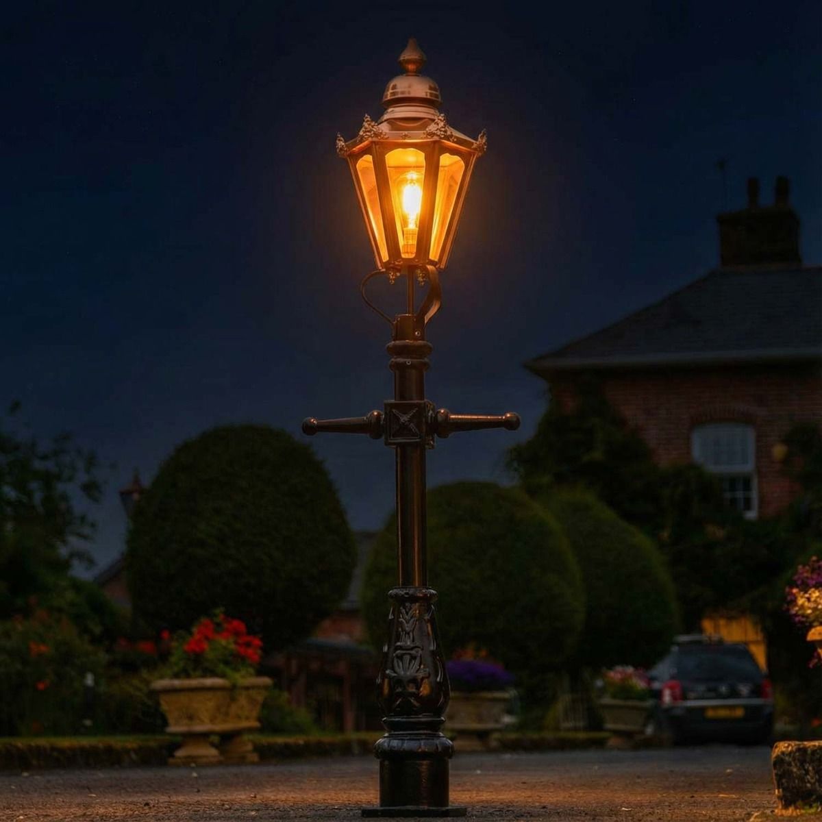Add style, sophistication and elegance to your home and garden with this fantastic lamp post. Smaller in stature than the more traditional lamp posts, this lamp post still features all the traditional Victorian embellishments. Complete with a copper hexagonal lantern and frog collar, this lamp post has been created using high quality steel whilst the base has been created using cast iron. Complete with a fixing plate, with pre-drilled holes, it makes for easy installation to any ground.