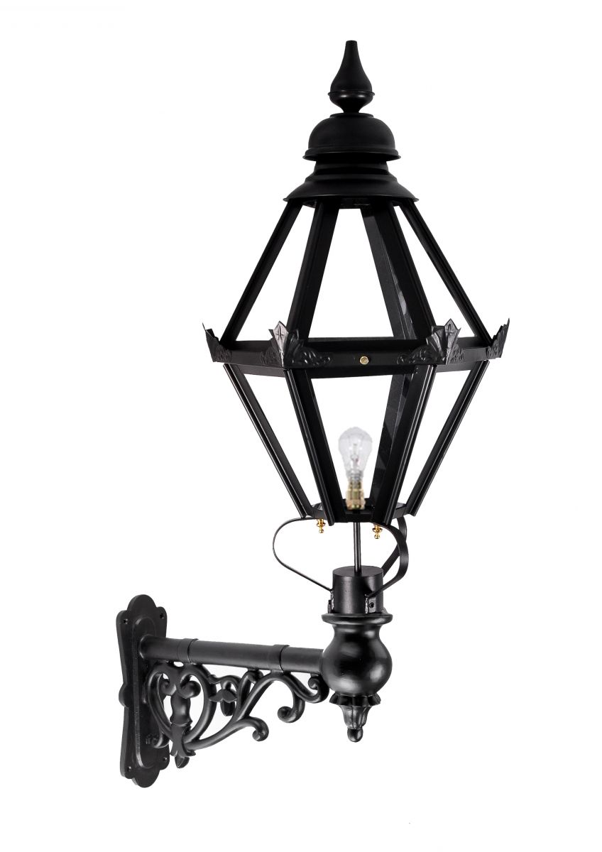 Hand-crafted from galvanised steel and finished in a sleek midnight black, this unique lantern is the ideal testament to traditional Gothic design. Taking inspiration from the large spires seen adorning Gothic architecture throughout history, this lantern features a unique hexagonal diamond design fitted with a tiered upper finial, embossed corner finials and twelve integral panes of clear perspex. This lantern comes complete with a lower mounted bracket which features a beautiful scrolled design and has been expertly cast from robust aluminium. This lantern has been specifically designed for wall mounting and would look ideal fitted beside a door or entryway where it will invite a real sense of period grandeur.