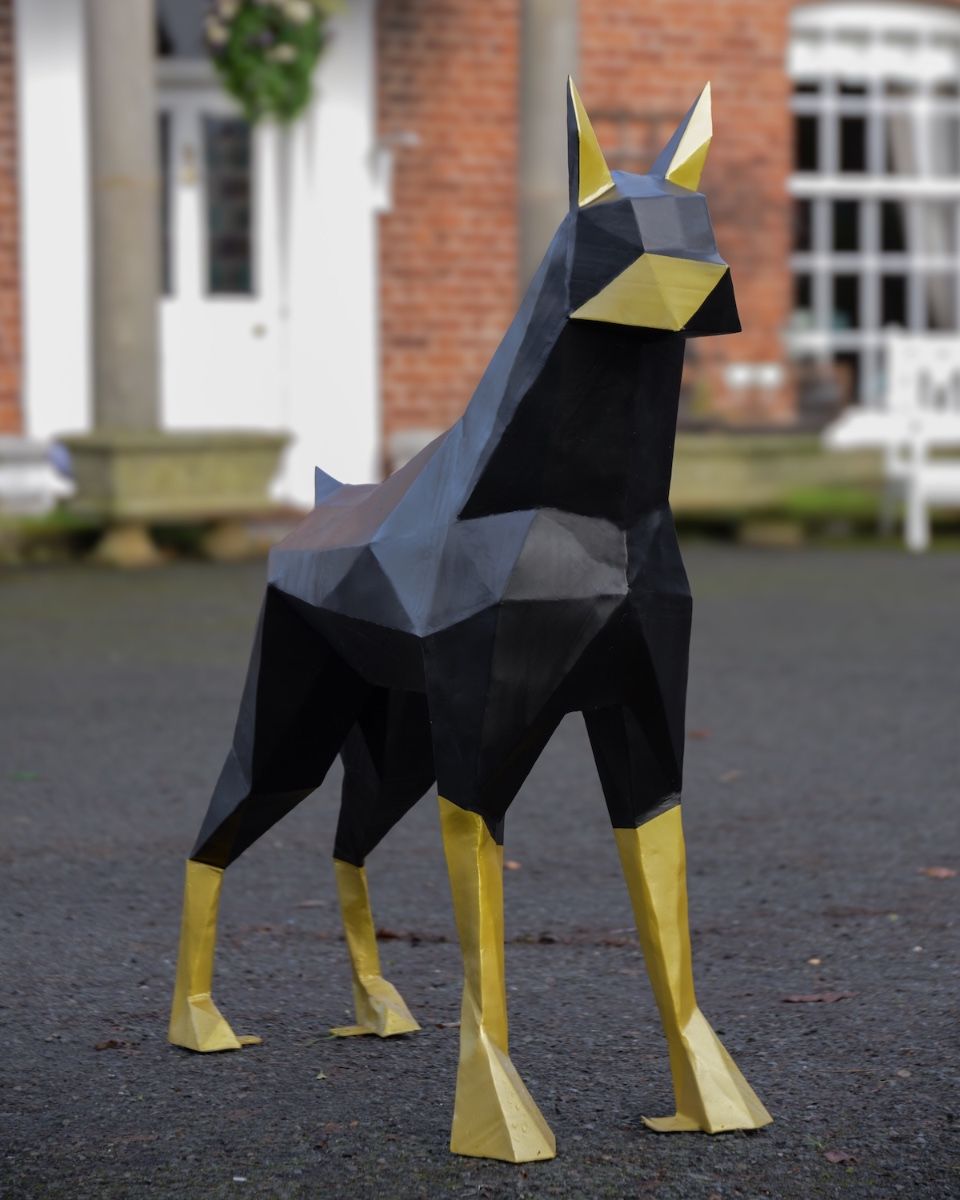 This standing dimensional Doberman is a contemporary departure from more traditional hound sculptures. This upcycled steel drum design blends sleek, sharp design with rugged, heavy-duty steel. This piece has been finished in black and gold to create the classic, instantly recognisable proud Doberman coat.