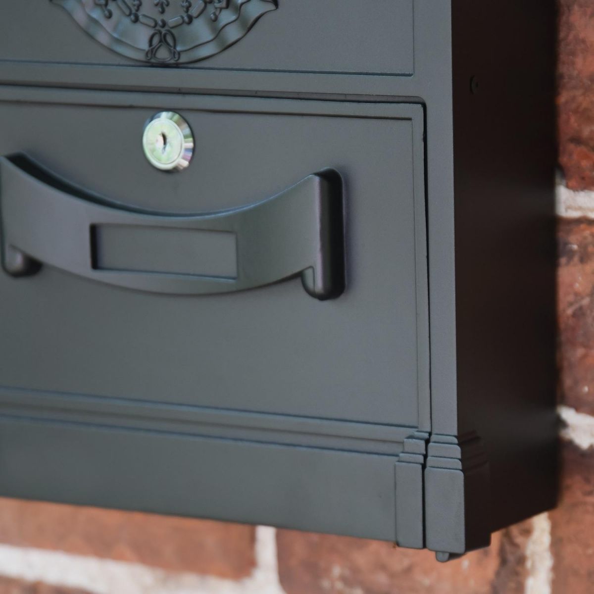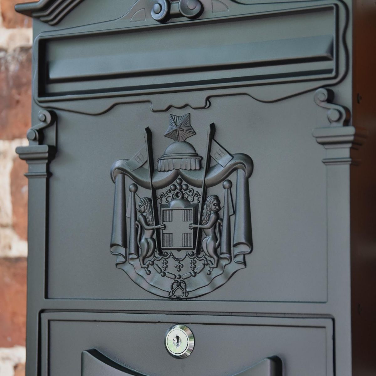 Created using high quality cast aluminium and finished in a sleek midnight black, this post box oozes traditionalism and practicality. With a regal arched top and a central crest motif, along with column shaped sides and a filigree design, this post box will look best when placed on period homes. With a lockable door to remove post, the aperture features a swing letter flap to keep mail safe and secure within.