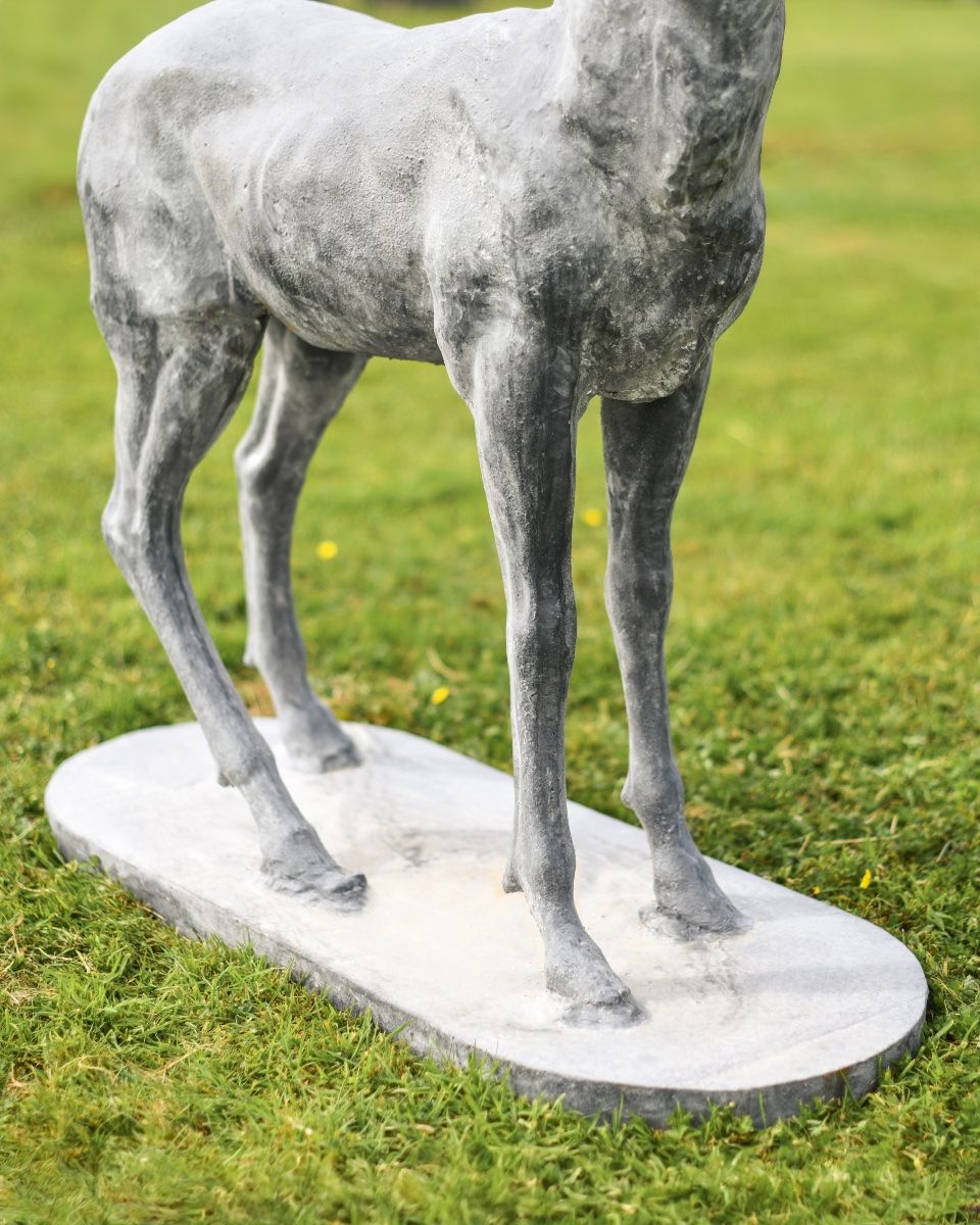 Expertly crafted from robust cast iron, this beautiful stag sculpture is a must for adding a statement to your outdoor setting. Finished in a leaded effect to highlight each detail, this life-size deer sculpture includes perked ears, expanding antlers, defined muscles and fur-like etching throughout. Complete with a sturdy oval-shaped base, this sculpture is ready to be safely placed in your garden or grounds. Great as a centrepiece within a large garden, or paired with another at the entrance to a drive.