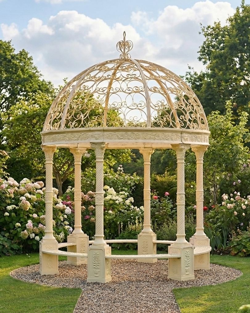 Made from high-quality wrought iron, our stunning six-plinth gazebo comes complete in a delicate, and smooth French Cream finish. A truly amazing piece of work, with a beautifully detailed roof offering an overlapping segment of free-flowing circular motifs that work together connecting to the fout-tiered finial. Each of the six plinths is traditional in design, with the column itself being carved with a wave-like pattern separated by a central motif similar to that shown on the top of the circular design.