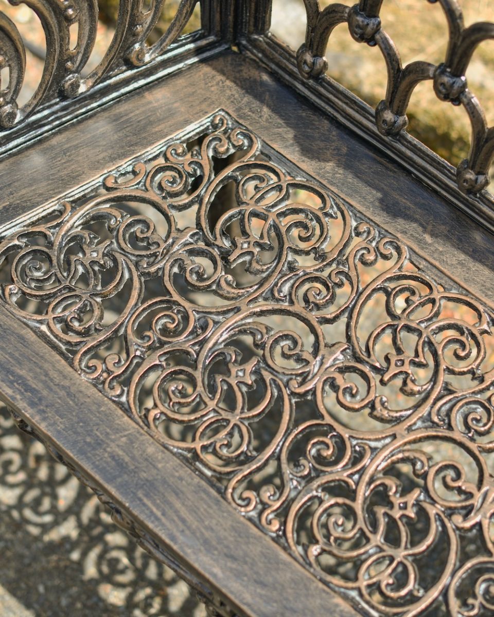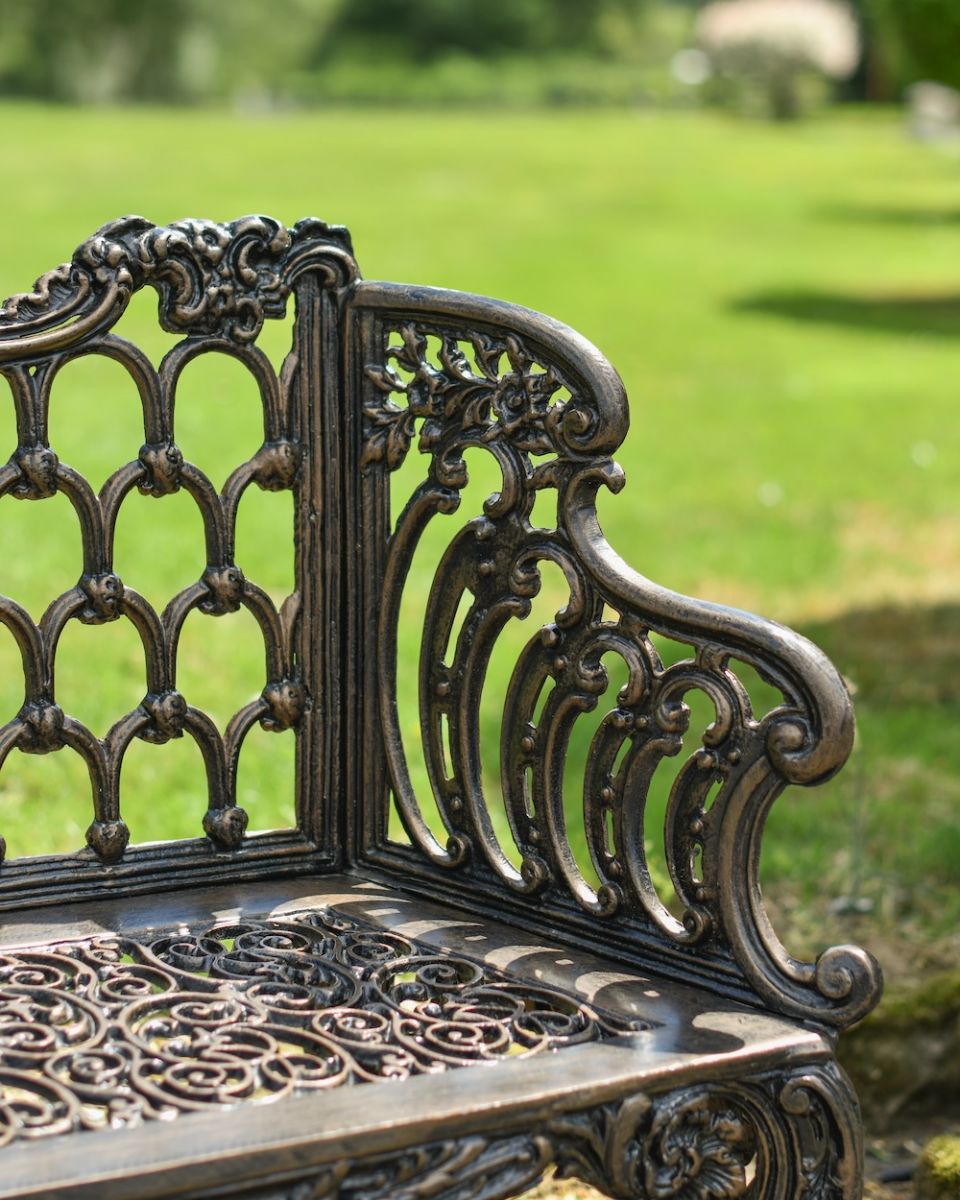 Crafted from quality metal, our “Edith” garden bench is full of beauty and charm. In Christianity, the name “Edith” means to be rich and blessed; our baroque bench certainly reflects its name! Crafted from recycled aluminium; perfect for those looking for quality pieces with the environment in mind. Ornate detailing throughout the piece showcases its grandeur and elegance. Hand-finished in a beautiful brushed gold, each piece is charming and unique.