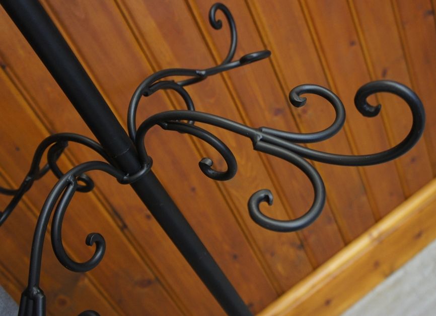 This attractive and ornate stand has been hand crafted using wrought iron and finished in a satin black colour. With eight arms in a vintage scroll design, this beautiful stand also has a wide circular base to create a strong and stable stand. With two layers of four arms, it is perfect for holding numerous accessories and garments.