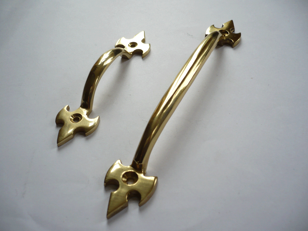 Fleur de Lys Cabinet Handle. This cabinet pull handle has been adorned with a fleur de lys embellishments. Supplied in a polished brass lacquered finish this draw pull comes in a choice of lengths and available in a bright chrome finish,