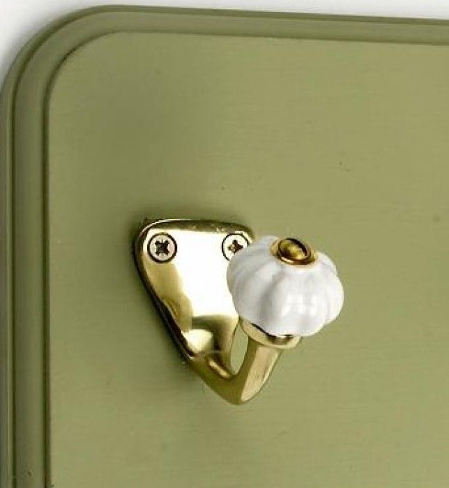 The hook is made in solid polished brass and has the added decoration of a delightful ceramic, fluted finial.