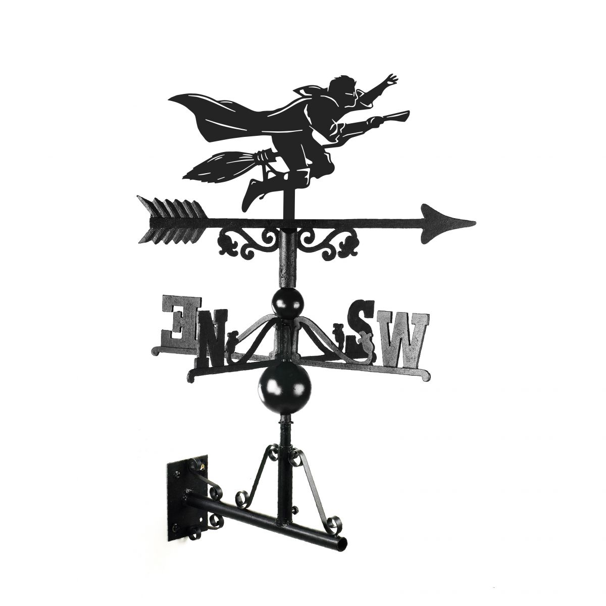 Are you ‘seeking’ the perfect weathervane? If so, look no further. This unique flying wizard weathervane is the perfect companion to any house or outhouse and certainly won’t ‘snitch’. With the wizard upon his broom, he stretches and points in the direction of the wind. Created in cast iron and thick steel, this piece has been finished in a midnight black. This design is mounted onto a traditional, fletched arrow and comes complete with directional arms and a universal bracket for easy installation.