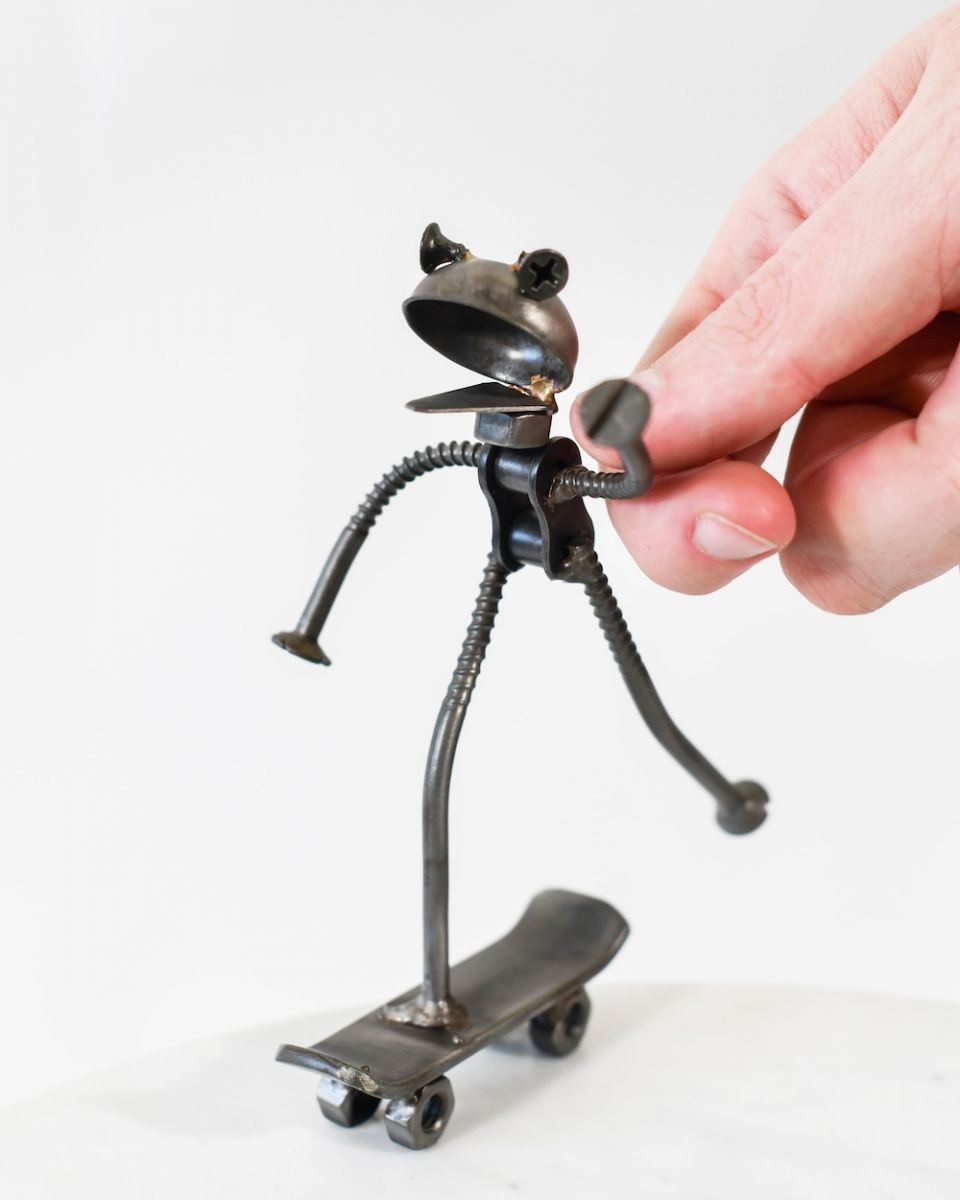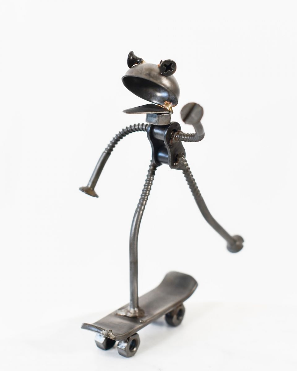 Our Recycled Metal Frog Skateboarding Sculpture has been cleverly reimagined from scrap metal pieces into a charming sculpture that would liven up any workspace or shelf. A loveable gift that has the added benefit of saving scrap fixings from landfill!