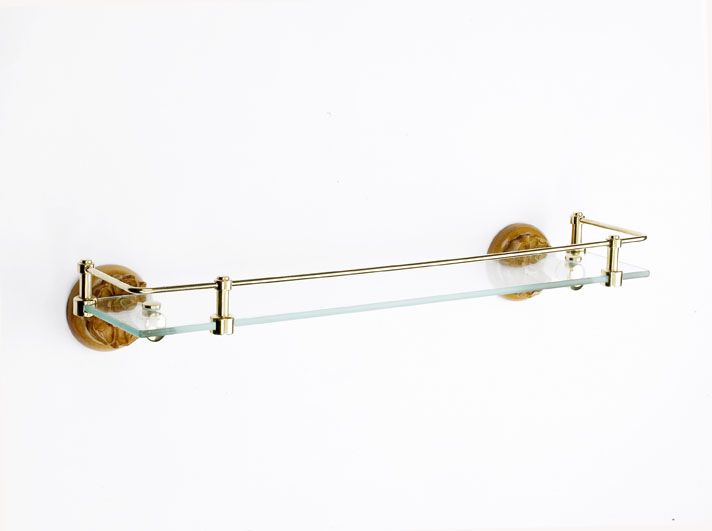 Our Tudor Rose Glass Shelf is stylish and practical. Compact in design to be placed in the smallest of Bathrooms. With the Added Security of a Brass or Chrome Rail, not only stylish but will stop your accessories rolling off the shelf.