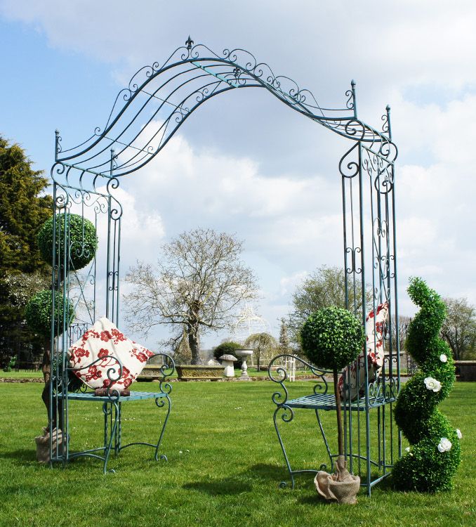 This fabulous piece of garden furniture is a real eye catcher and perfect for a secluded corner or placed across a pathway or garden entrance. Handmade in wrought iron, it features two wonderful seats at the base of each side, amidst a riot of scroll work and pretty detail, where you can sit and chat, whilst enjoying the beauty of your surroundings. Hand painted in pale “romantic blue” shabby chic, it is perfect for growing roses or clematis up and over and would look incredible overflowing with flowers and foliage. Equally this love seat can be simply painted in any recommended outdoor metal paint and left undressed for visitors to enjoy the beauty of the fine Ironwork will last.