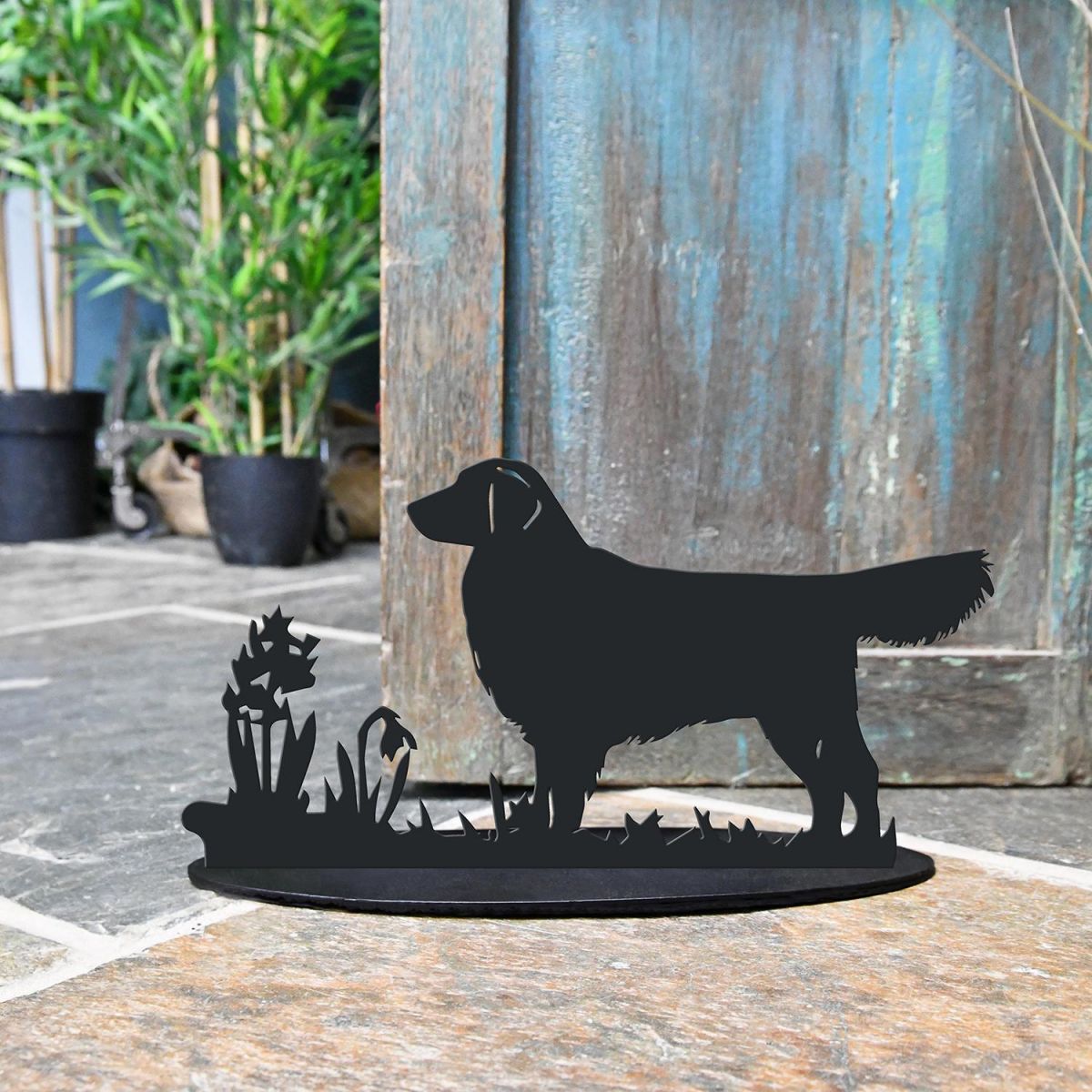 Add some style and character to your home with this multiple purpose door stop. Ideal home accessory to prop open doors to allow for air flow to pass through the home, it can also make a beautiful indoor ornament during the winter months. Crafted from high quality robust steel and finished in a sleek midnight black finish, this door stop features the silhouette of a golden retriever stood within a field of flowers. Ideal gift and accessory for any golden retriever lover and owner.