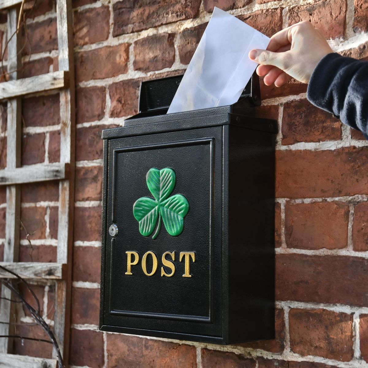 Synonymous with success and luxury our Clover “Oxford” Post Box is manufactured by hand using galvanised steel and hand cast aluminium detailing to the door and letter flap. All finished in a hardy black powder coat with hand painted green clover detailing and gold "POST" highlights.