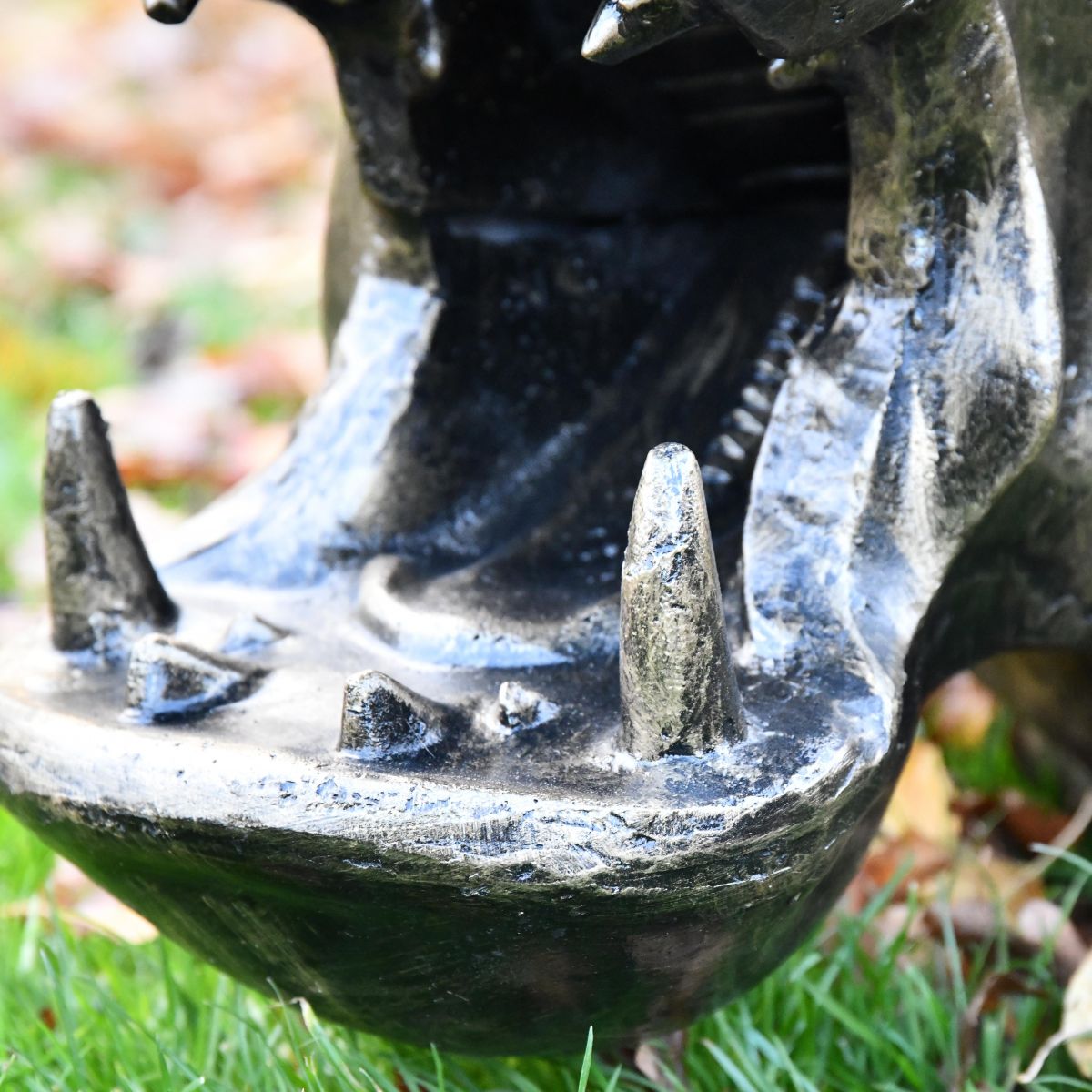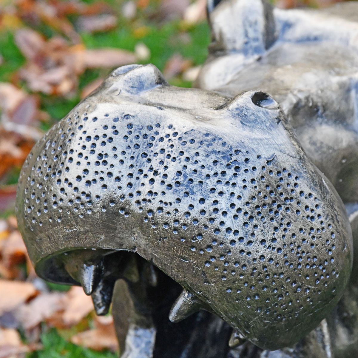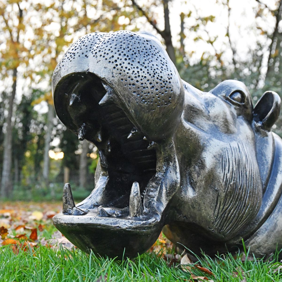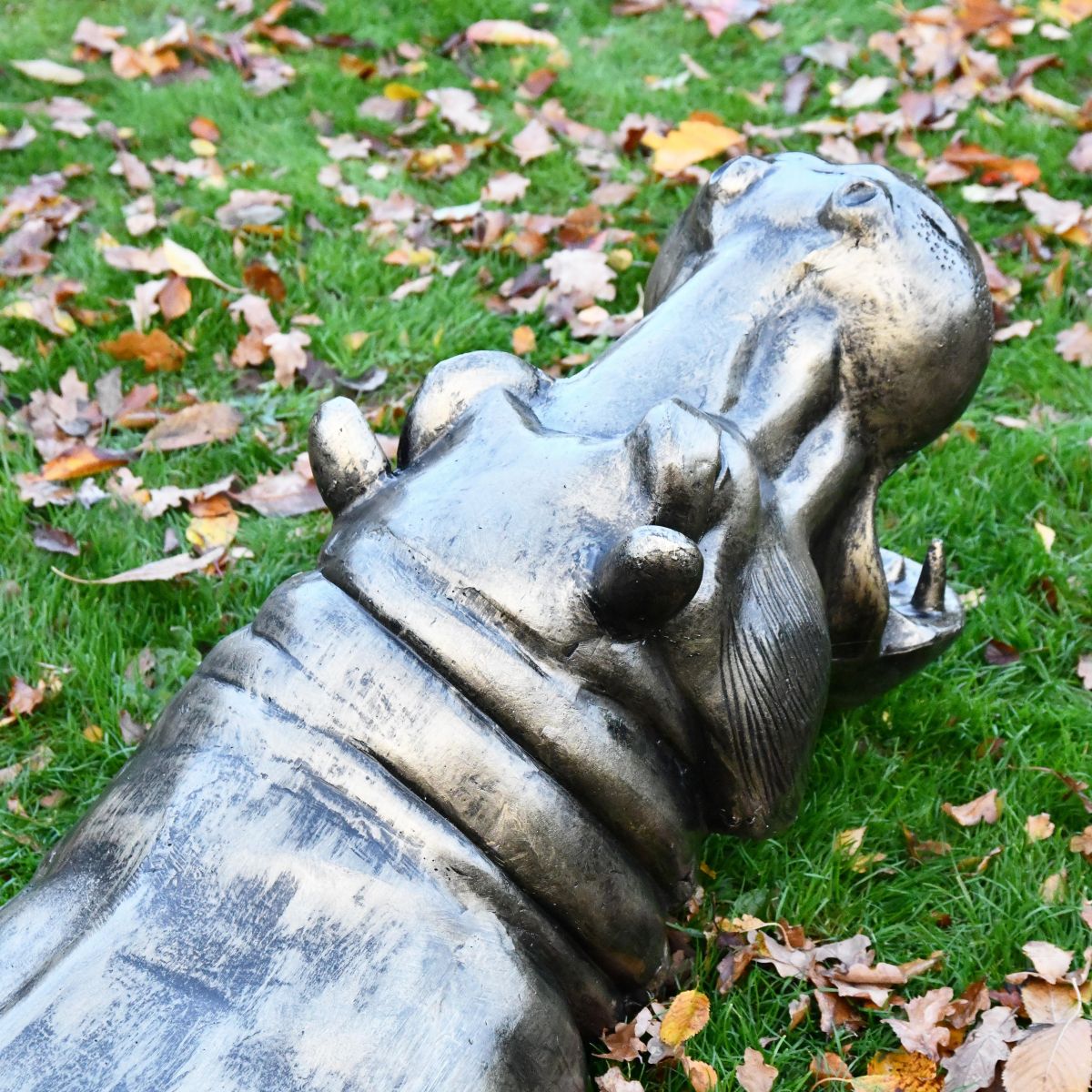 As if emerging from a body of water, this fantastic half hippo sculpture is ideal for adding character and charm to any pond, lake or grounds setting. Cast from aluminium and finished in a gold and black finish, this hippo can be seen with mouth wide open displaying his large teeth and tusks, which are often used for fighting and threating off predators. Highly detailed from head to tail, this half hippo features whisker marks around his muzzle and wrinkles around his face. A wonderful way to add sub-Saharan African vibes to the desired location.