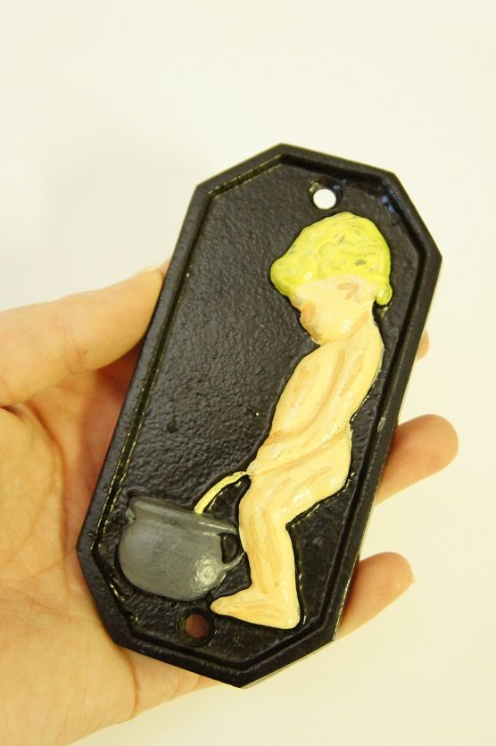 This charming little boy toilet sign is hand painted and adorned with the classic image of a little boy peeing, in a potty. Hand cast solid aluminium sign, with very fine detailing on the paintwork, by our extremely talented artist. A lovely little sign, with a touch of the oh la la's!