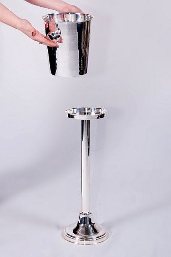 Traditional wine or champagne cooler, complete with stand, and two carry handles. All hand made in high grade brass, this traditional, vintage champagne cooler, has then been carefully electroplated in Nickel Silver.