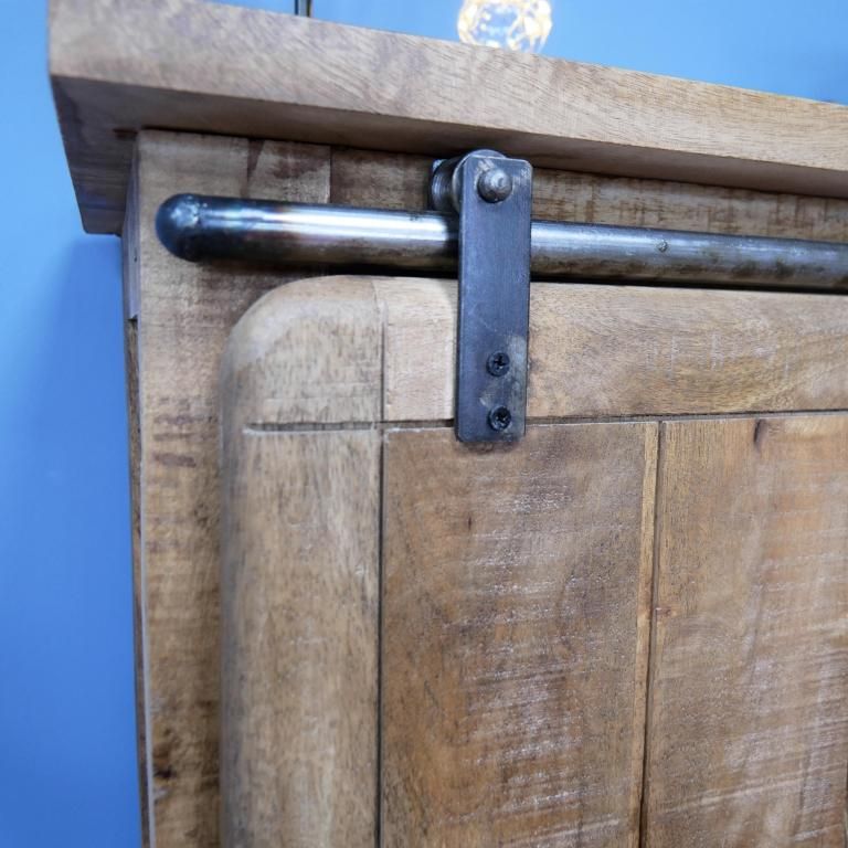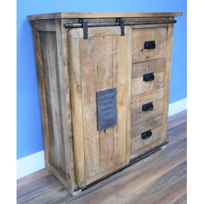 Crafted from a combination of mango wood and iron, this industrial-styled storage cabinet is the perfect addition to any living space, hallway, or bedroom. Complete with iron detailing for the handles as well as the sliding door hinge, and iron plating on the sliding cabinet that reads “JUPITER IRON WORKS EST 1925”