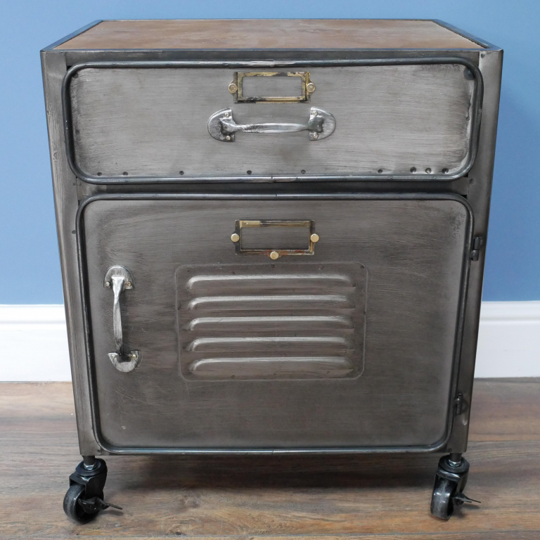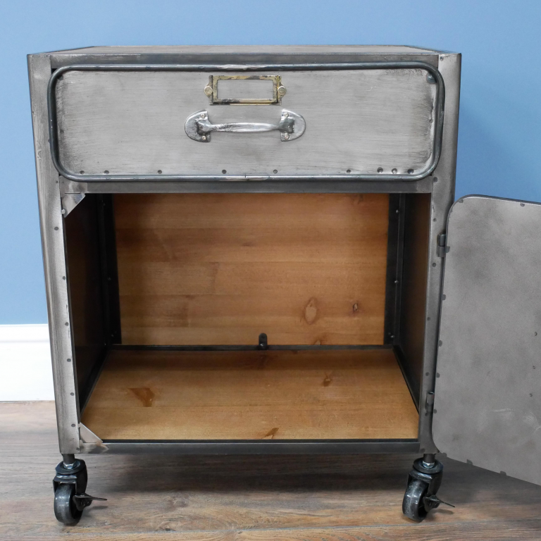 Crafted from high quality steel and finished in a brushed silver finish, this industrial inspired bedside cabinet is the ideal storage solution for those who want to keep their bedroom on trend. Complete with a drawer and a cabinet door, for larger items, this bedside cabinet is situated on wheels for easy moving around the room, perfect for when cleaning. Complete with small metal name tags, you’ll be sure that organisation will be top notch.