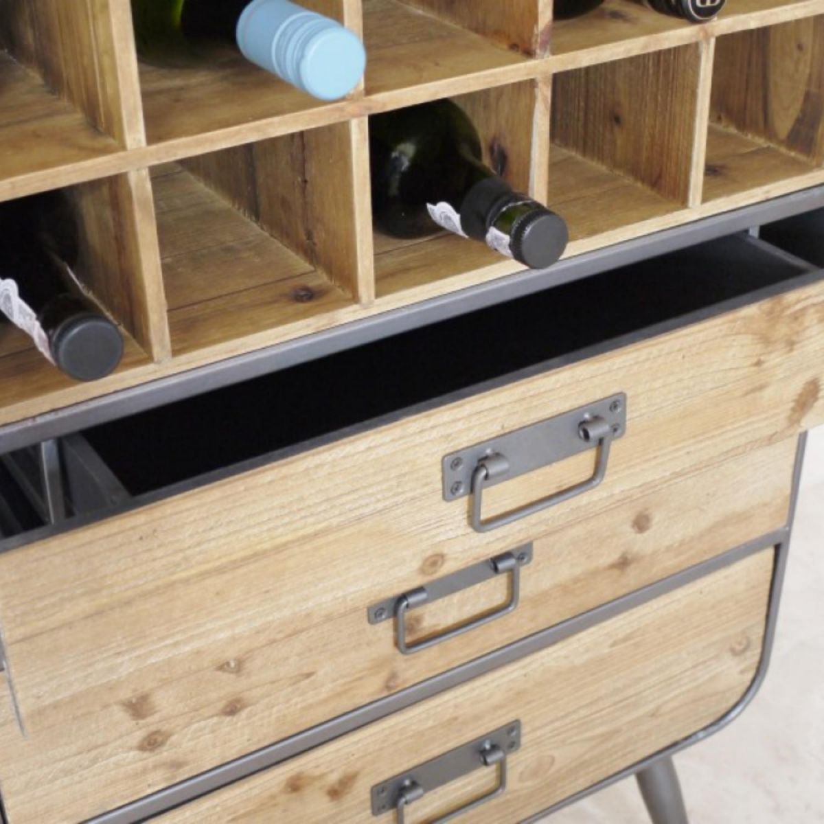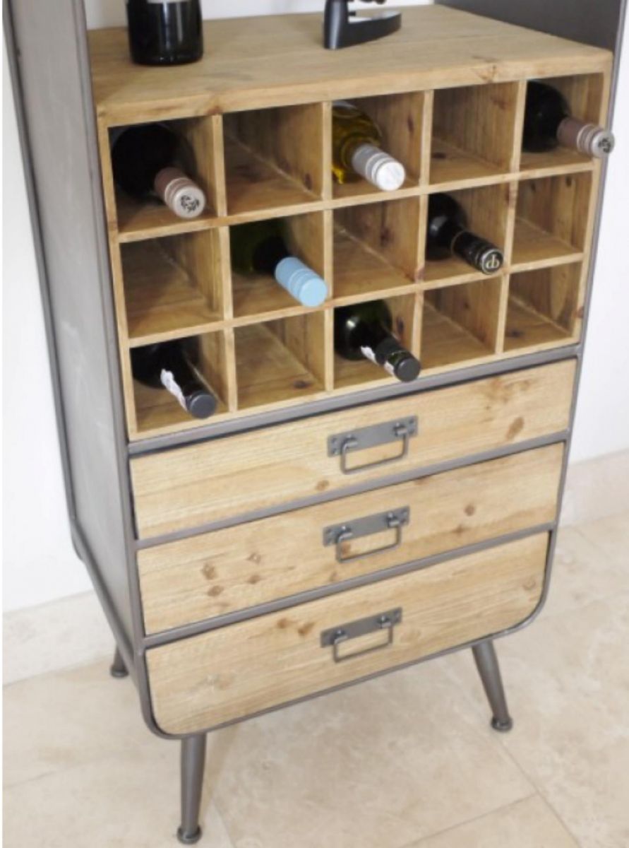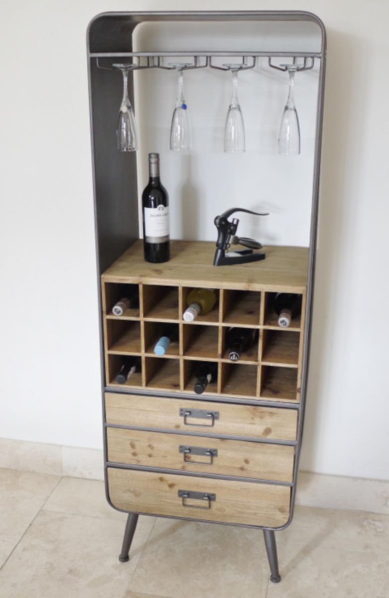 Made from fir wood and iron, this wine cabinet features all the necessary components in one place. Room for fifteen bottles, there are four rails for hanging glasses of different sizes and shapes and not forgetting the three additional storage drawers to hold all wine bottle items, from napkins to stoppers and openers. The combined wood and metal means this cabinet will complement any interior style and décor.