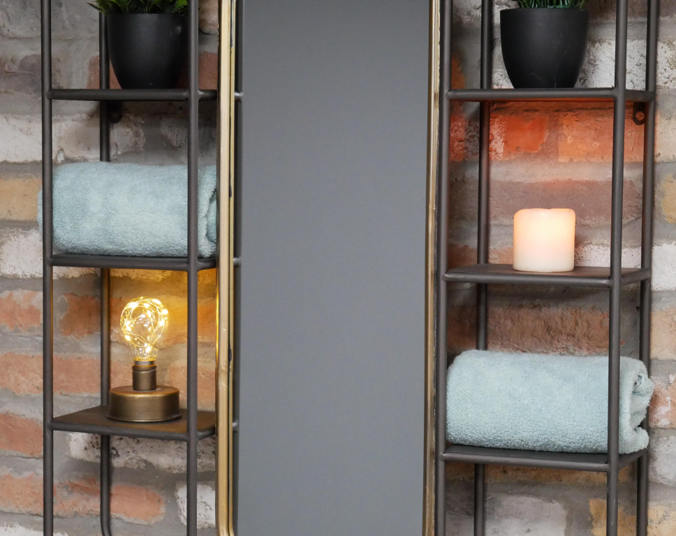 Crafted from high quality steel, this wall mounted unit features three shelves on each side, ideal for placing nik-naks, candles or toiletries. Complete with a central mirror which is completely adjustable, it is ideal for placement in hallways, bedrooms and also bathrooms. Inspired by the industrial period, thanks to the harsh metal finishing, the gold addition around the mirror adds character and charm to the overall piece.