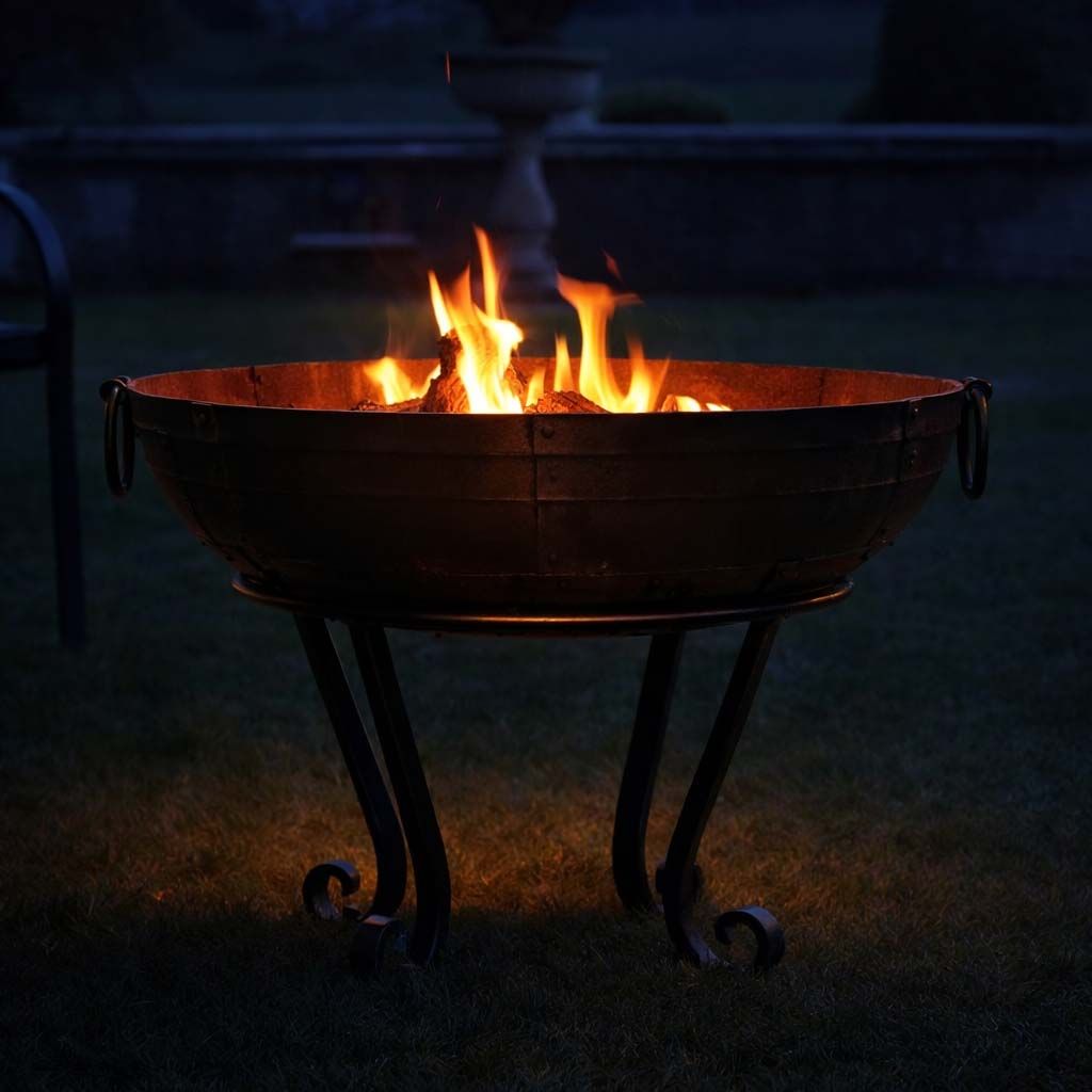 Originating from India, this beautiful handmade wrought iron fire bowl is a simple yet effective way to inject heat into your chosen outdoor environment. This Kadai bowl features authentic detailing throughout as seen in its integral side handles and riveted base. Complete with its own integral scrolled stand to help protect your grounds from intense heat during use, this wood burner is the ideal way to entertain your family and friends throughout the warmer months of the year. Simply fill with logs and kindling to bring a traditional Indian touch to your own back garden, patio, or grounds.