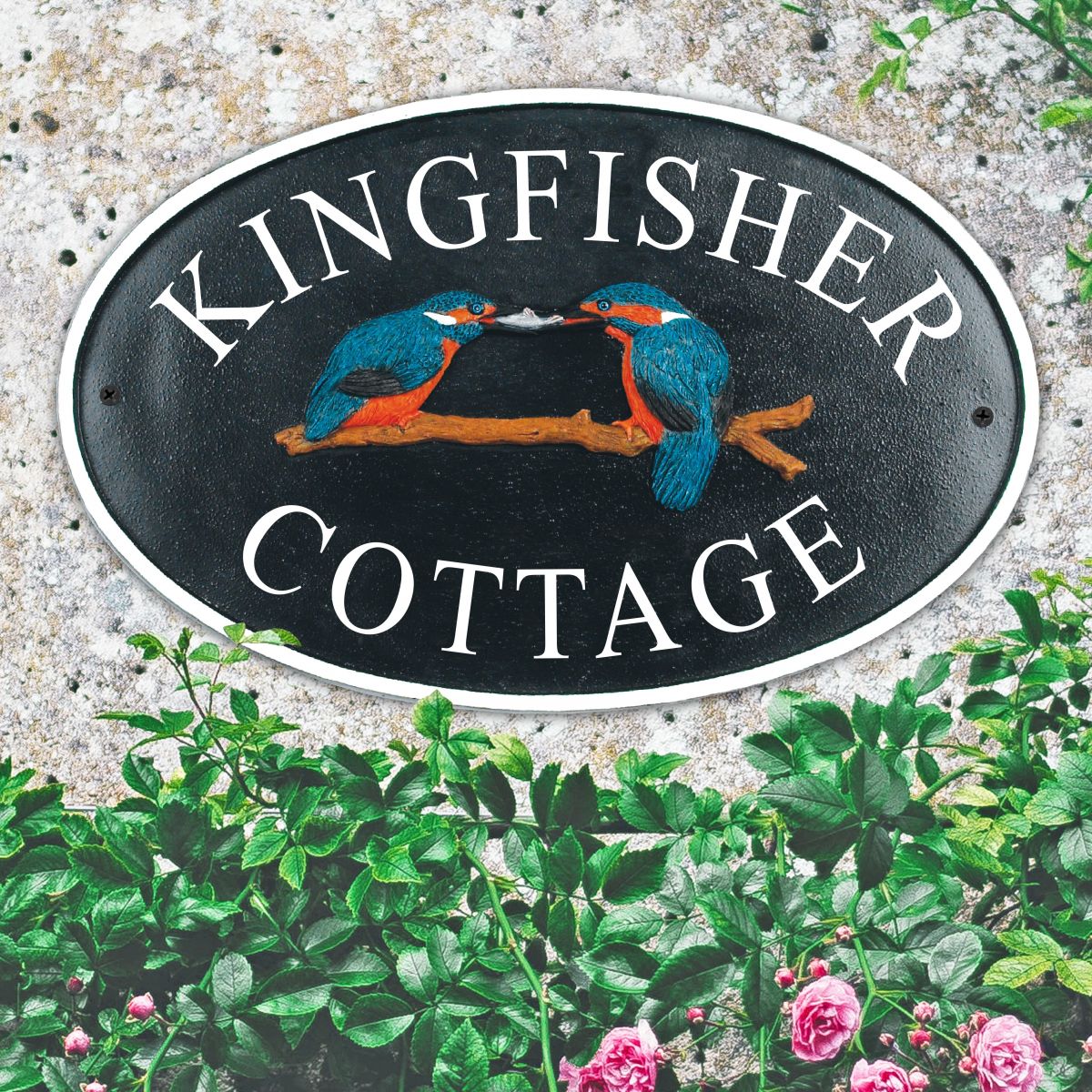 Handcrafted from high quality cast iron and finished in a black finish, two kingfishers sit upon a branch in the centre of the house name sign and are hand painted in an assortment of blues, oranges, and whites to mimic that of the real bird. Complete with two pre-drilled holes for easy installation, the cast iron sign can be personalised with any house name, street name or surname for a truly bespoke and personal addition to the home.