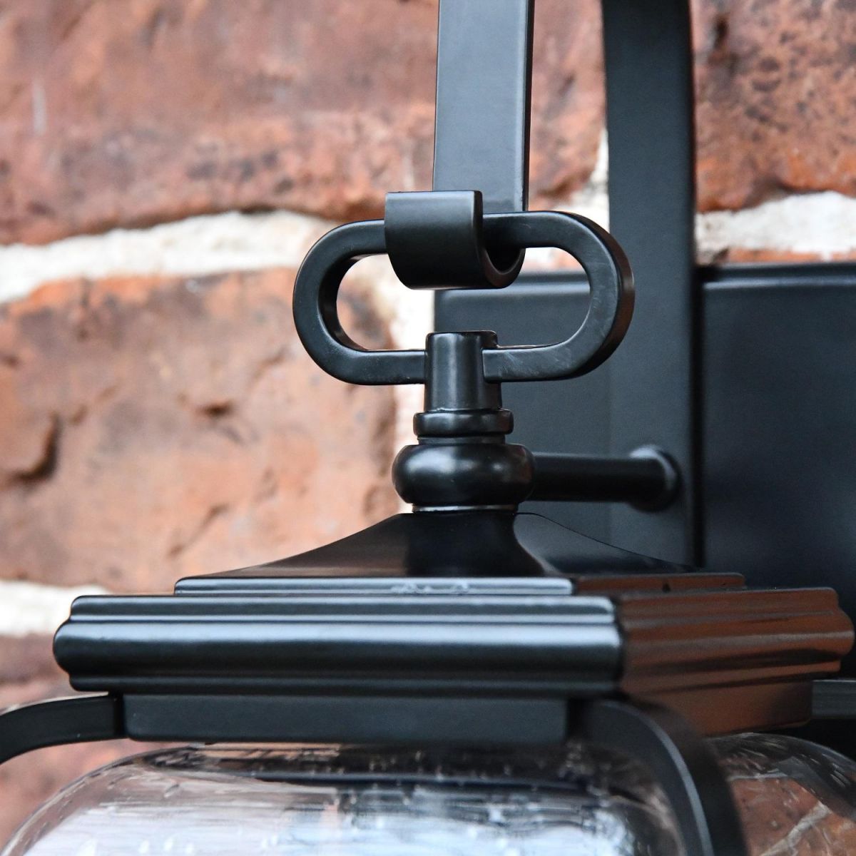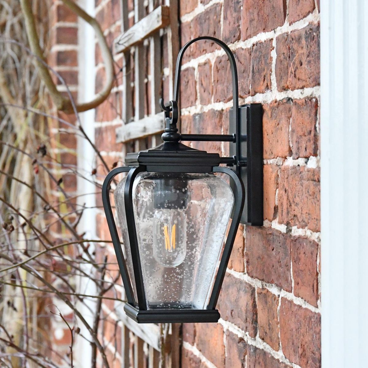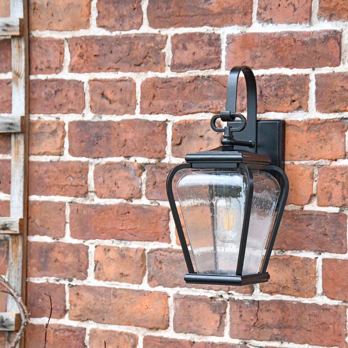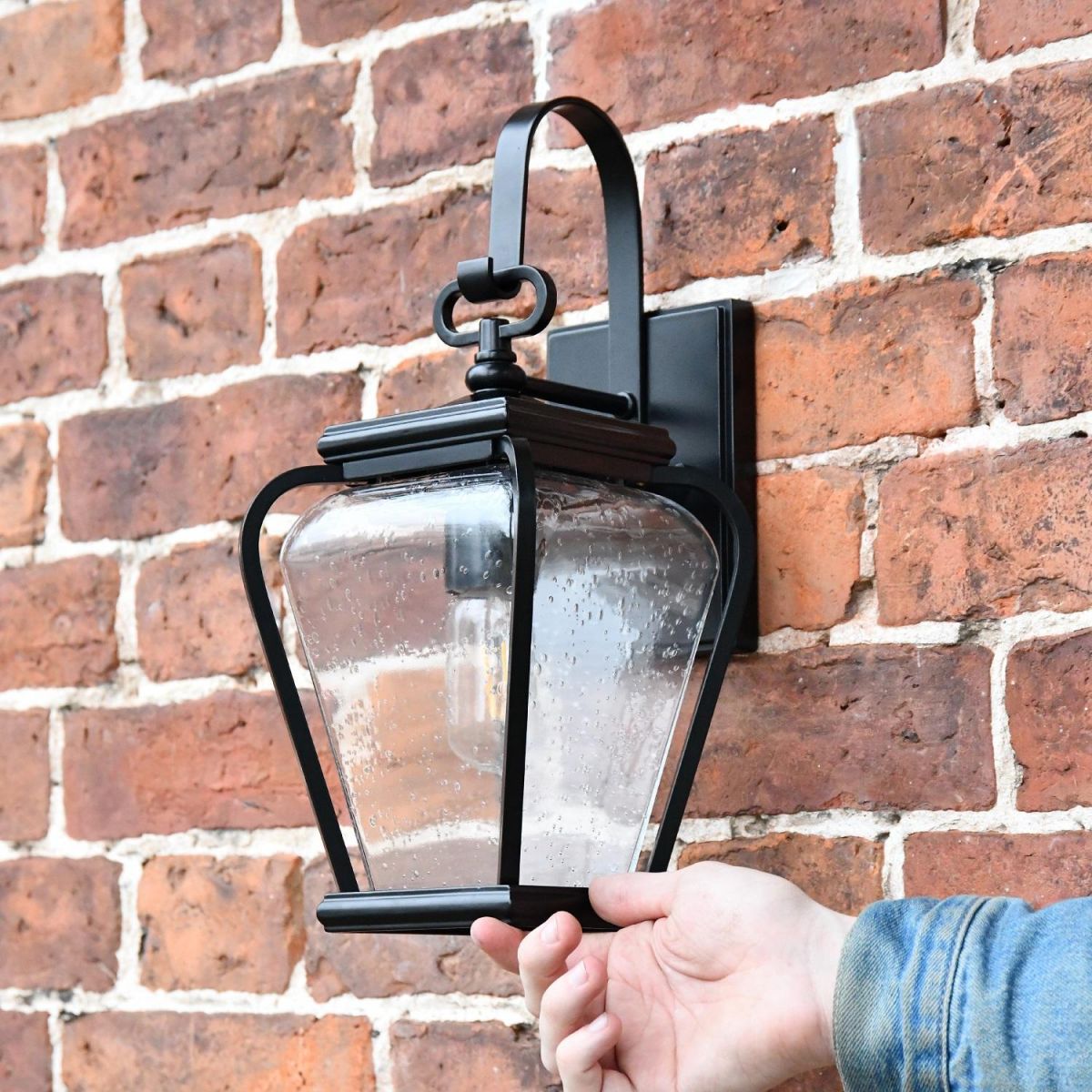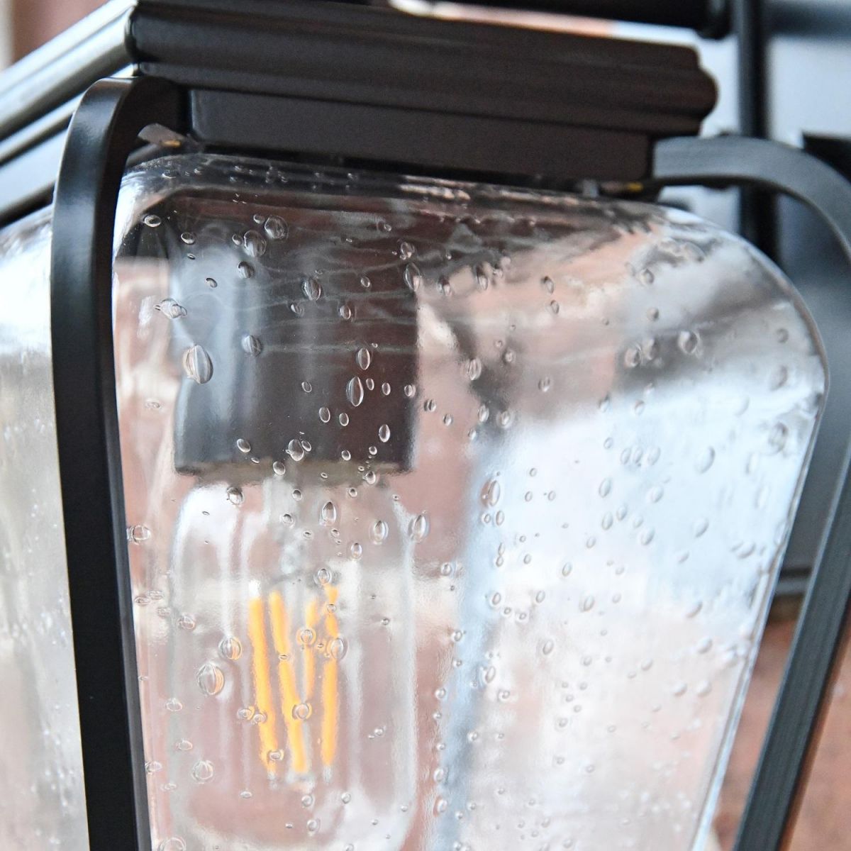 Combining traditional and contemporary design, this simple yet charming lantern has been inspired by vintage country styling. With its rectangular back plate and hook-like bracketry, this bulb-shaped lantern appears as if it has been hung up on the coast as it would have been during the late 1800's. Finished in a powder-coated black and completed with four panes of seeded glass, this lantern takes on a more contemporary feel. Complete with a squared, upper bulb holder for maximum downward light projection, keep it traditional and add a touch of modernity to your entryway or porch with this unique design.